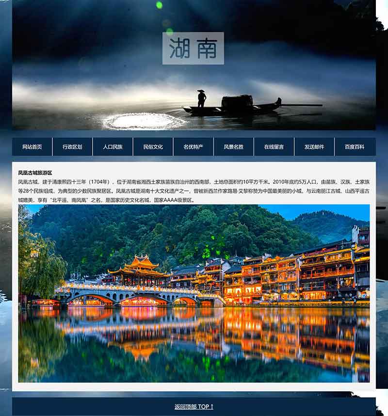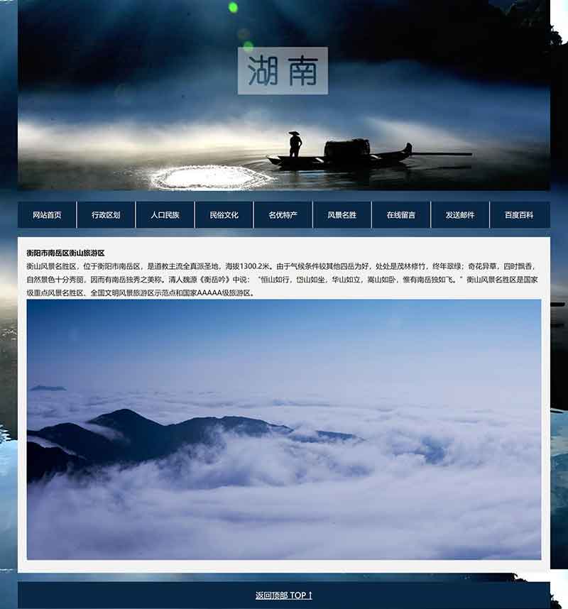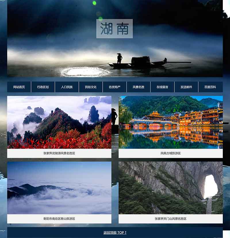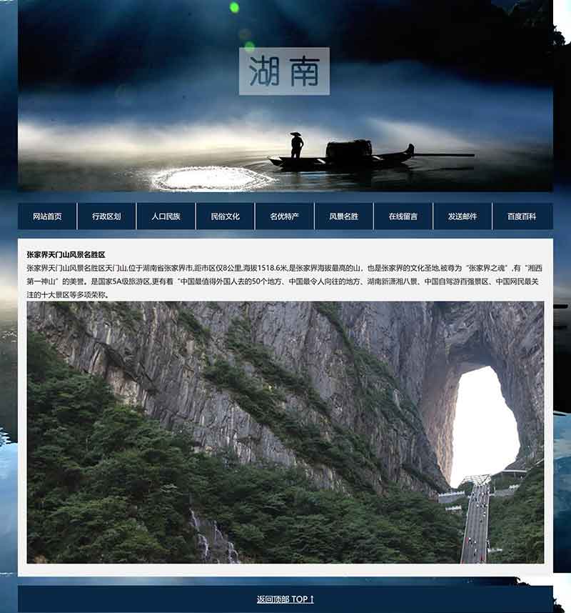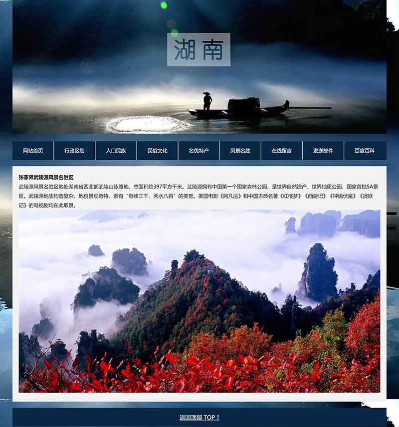 大學生我的家鄉湖南城市介紹旅游類靜態HTML網頁設計作業作品采用DIV CSS布局設計制作,內容包括:網站首頁、行政區劃、人口民族、民俗文化、名優特產、風景名勝、在線留言共11個頁面。其中風景名勝欄目下制作了4個三級景點介紹頁面。