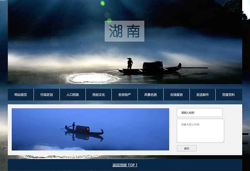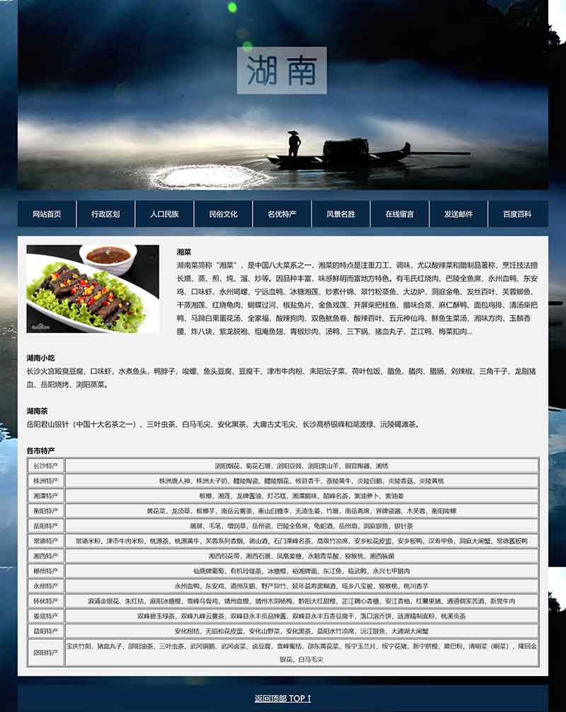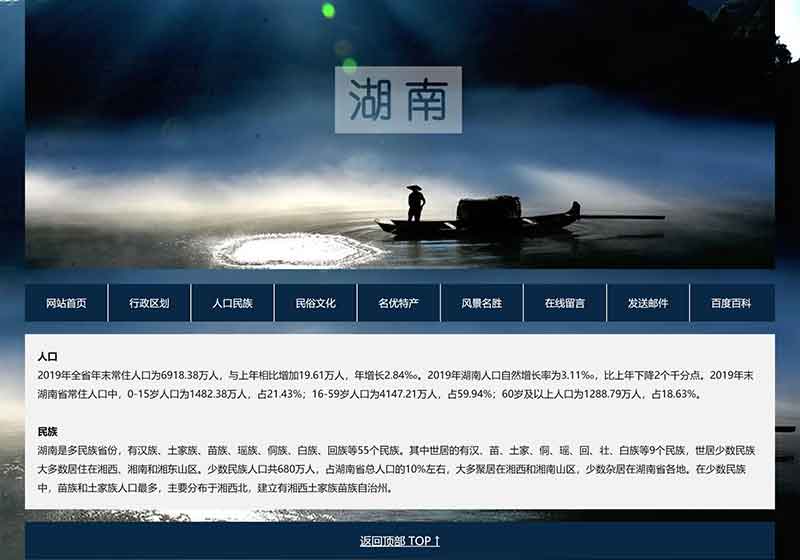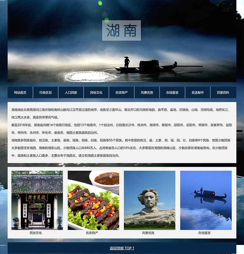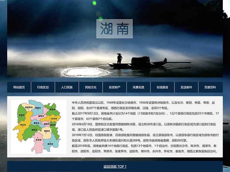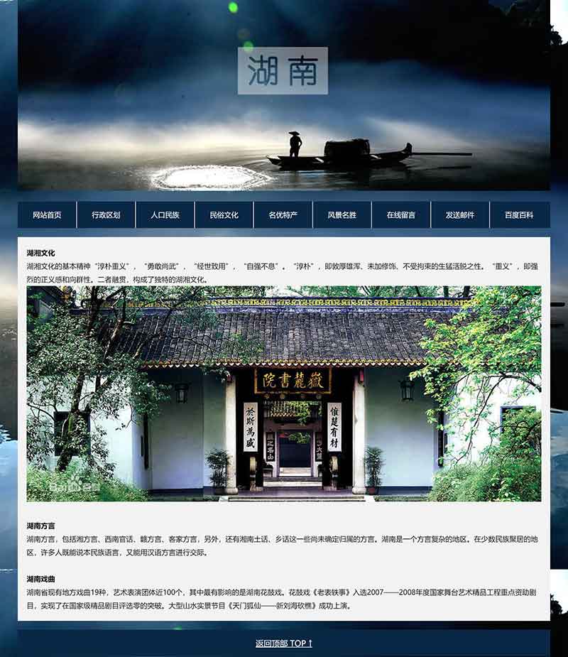 大學生我的家鄉湖南城市介紹旅游類靜態HTML網頁設計作業作品采用DIV CSS布局設計制作,內容包括:網站首頁、行政區劃、人口民族、民俗文化、名優特產、風景名勝、在線留言共11個頁面。其中風景名勝欄目下制作了4個三級景點介紹頁面。