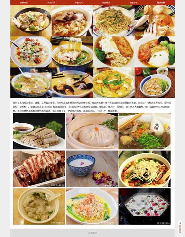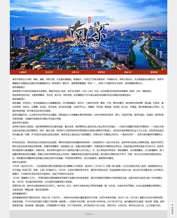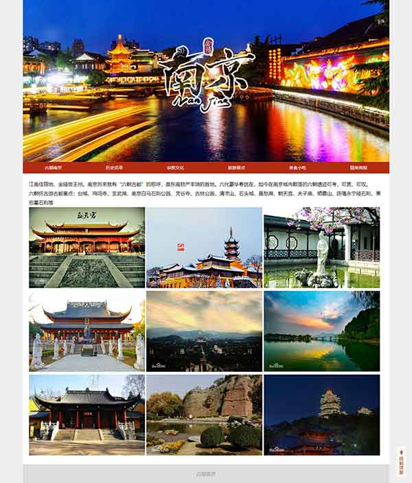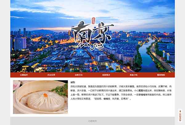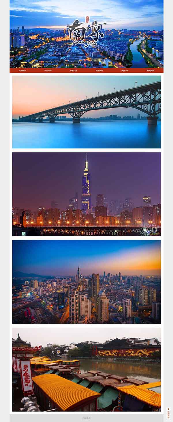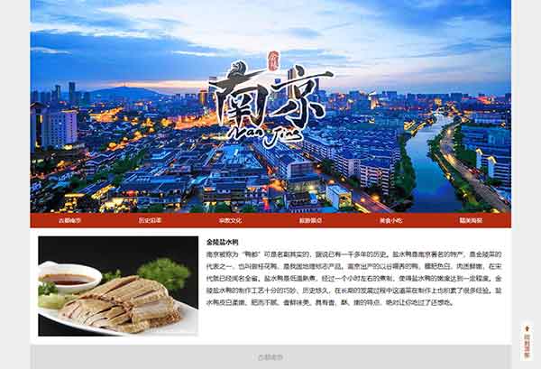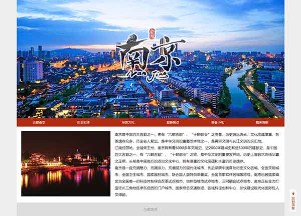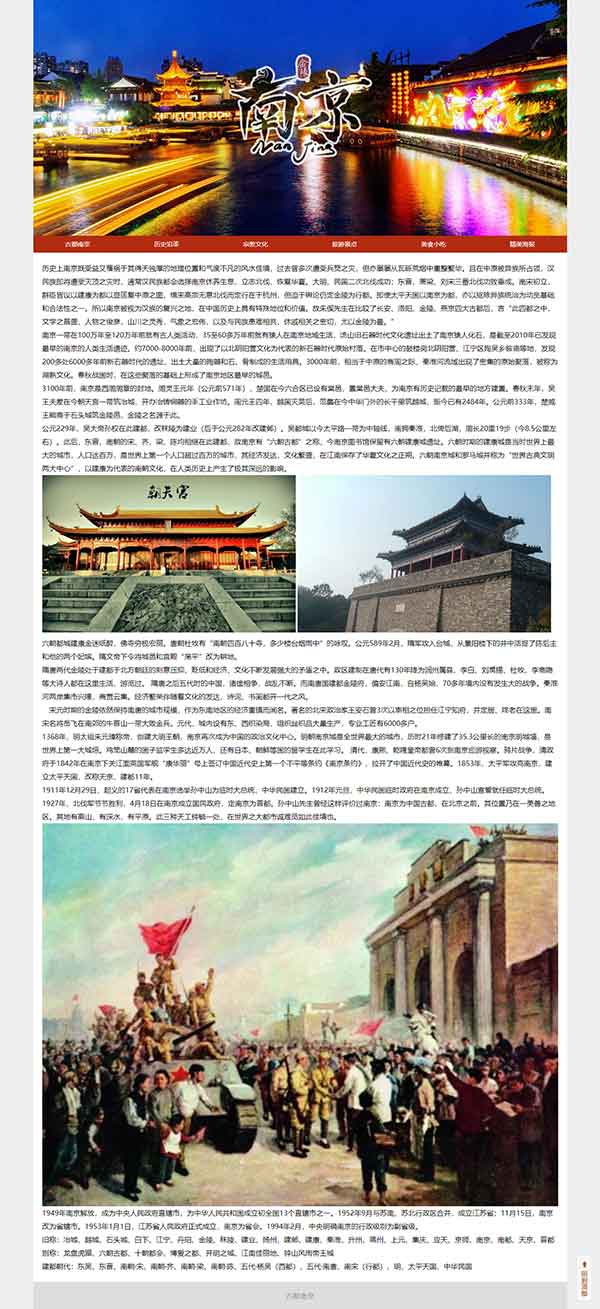 大學(xué)生南京旅游網(wǎng)頁內(nèi)容為介紹古都南京的網(wǎng)頁設(shè)計(jì)成品,介紹了南京的歷史、文化、景點(diǎn)、美食等。使用dreamweaver由table布局制作,共15頁,首頁1頁,二級(jí)頁面5頁,三級(jí)頁面9頁。