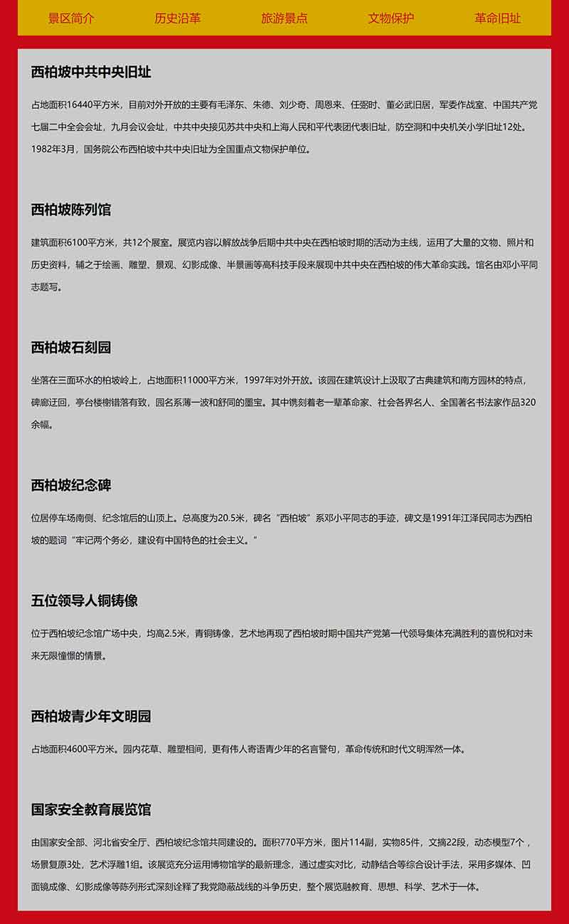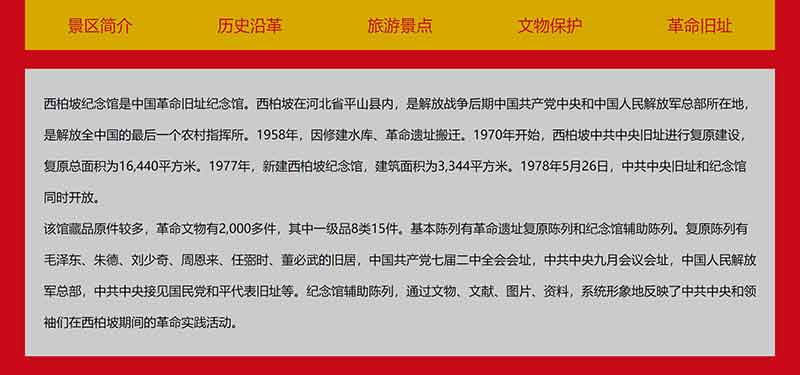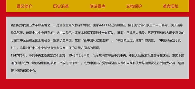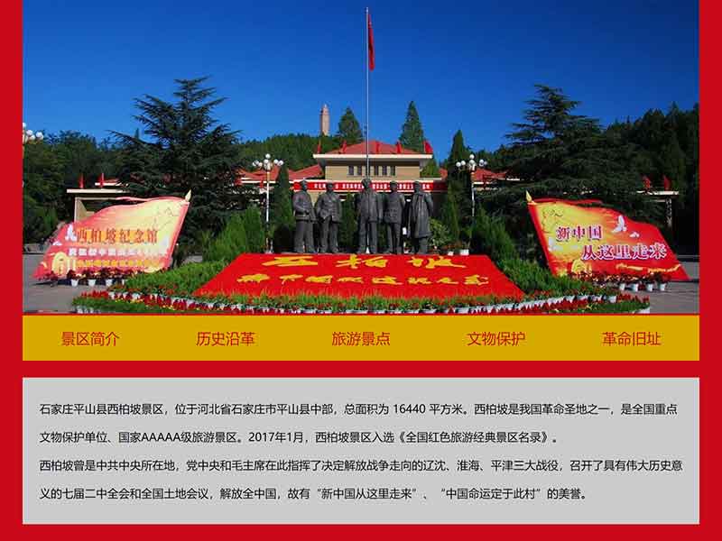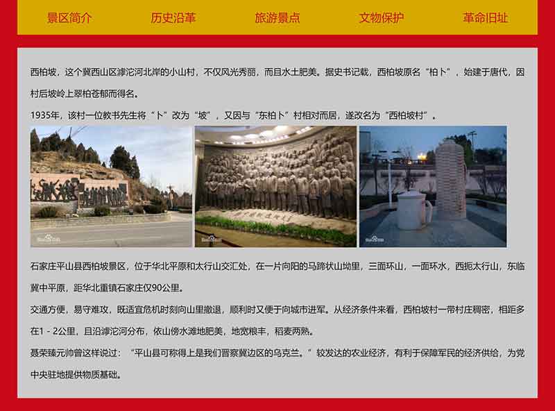 此大學(xué)生網(wǎng)頁設(shè)計網(wǎng)頁作品題材為河北省紅色旅游景點——西柏坡網(wǎng)頁設(shè)計,網(wǎng)頁內(nèi)容主要包括景區(qū)簡介、歷史沿革、旅游景點、文物保護(hù)、革命舊址,共計5個頁面。