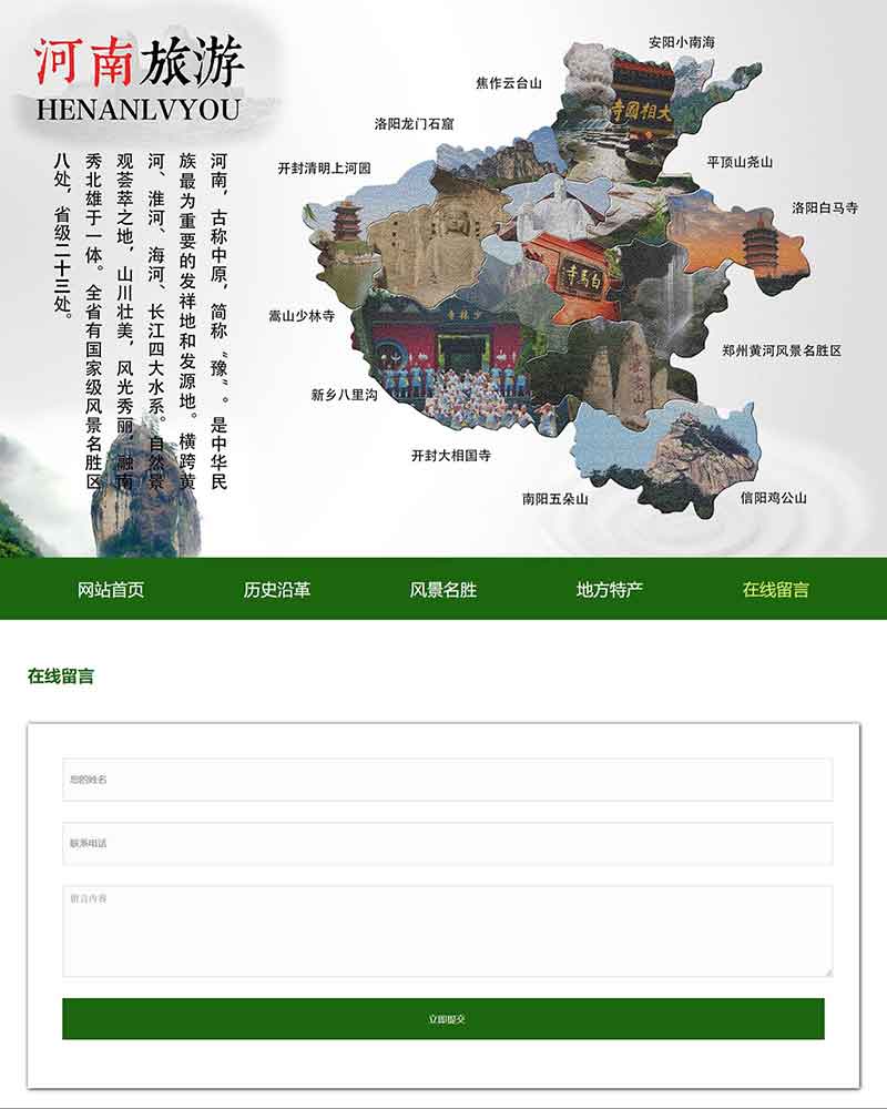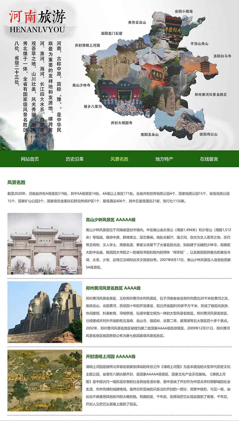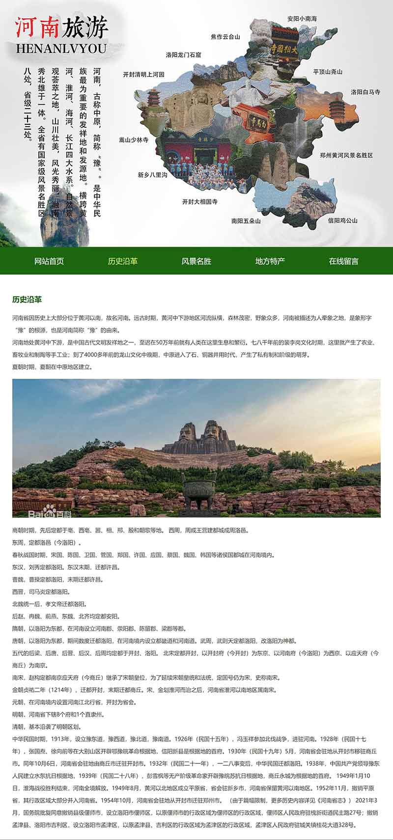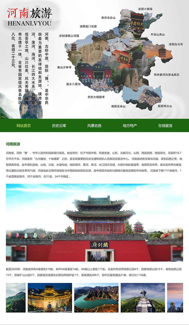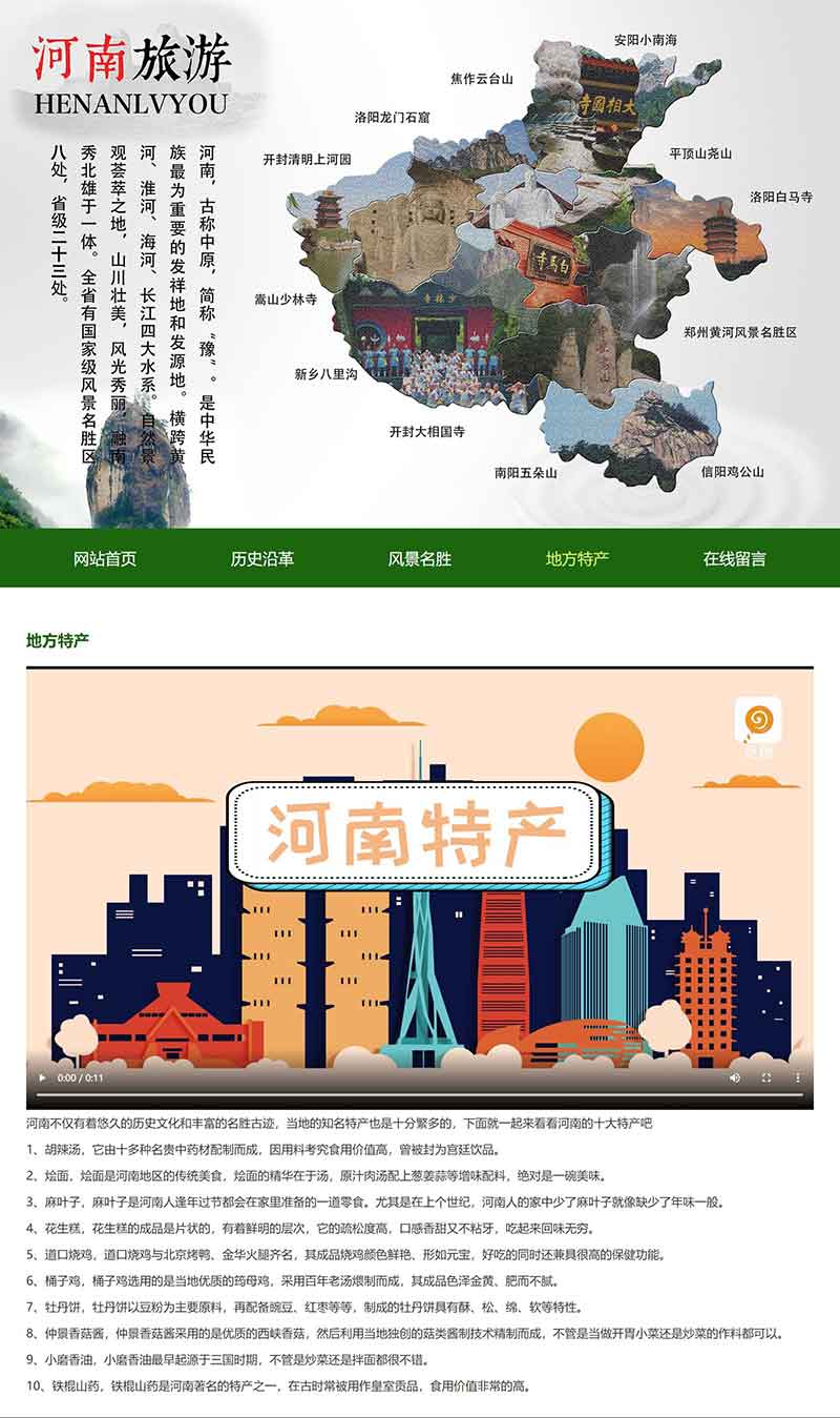 大學生旅游網頁設計作品共5個頁面,題材為河南旅游網頁設計,網頁內容包括:網站首頁、歷史沿革、風景名勝、地方特產、在線留言。技術方面主要應用了大學生網頁課程中的:自適應全屏大圖海報、自適應寬度欄目導航、導航鼠標經過及選中變色效果、段落圖文混排及字體設置、JavaScript圖片滾動、網頁視頻、在線留言表單等知識點。