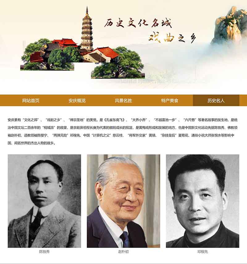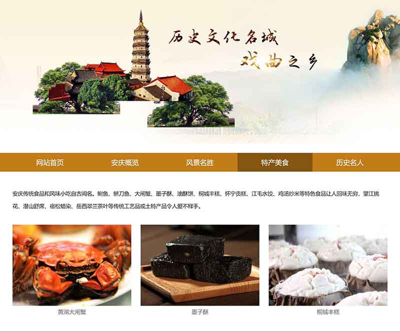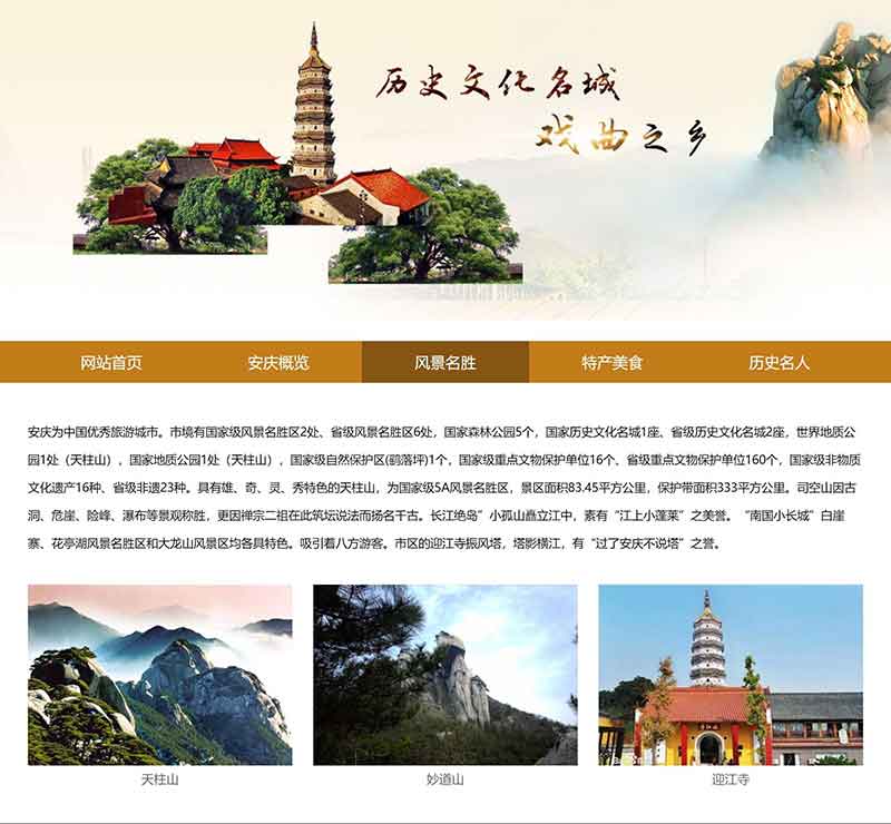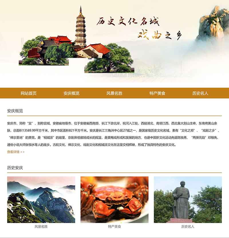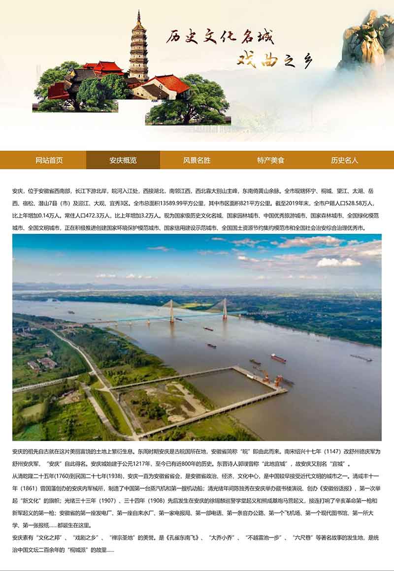 大學生我的家鄉網頁作業作品題材為歷史文化名城——安徽省安慶市城市介紹網頁,作品共5個頁,網頁主要包括網站首頁、安慶概覽、風景名勝、特產美食、歷史名人。圖片及文字內收集于網絡。技術方面比較簡單,主要包括:自適應導航及海報圖、DIV板塊背景及下劃線應用、段落圖文混排及字體大小顏色設置、導航部分設置了鼠標經過及選中效果。首頁與子頁面之間通過導航及超鏈接進行合理鏈接。整體排版干凈簡單,圖文并茂,作品完善。