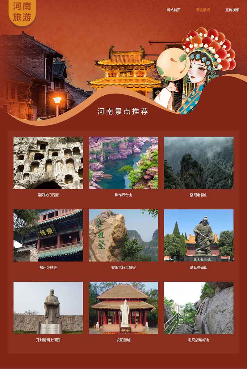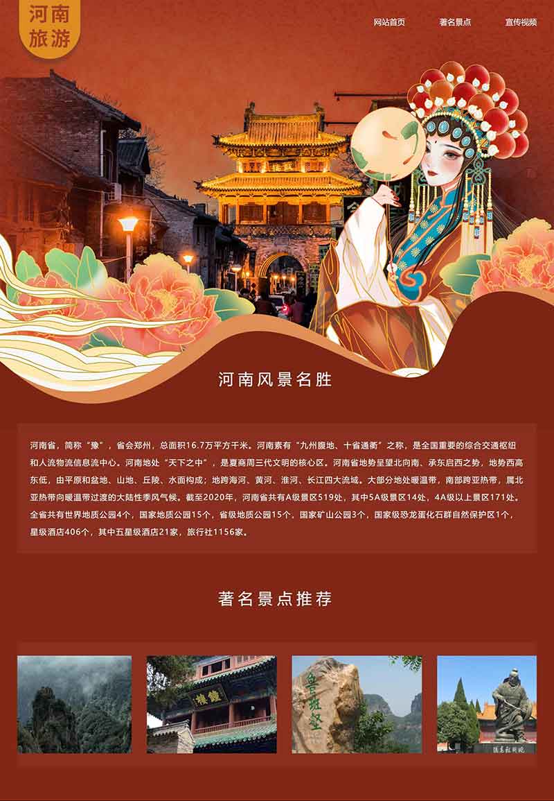河南旅游景點網頁設計作品采用DIV CSS布局制作,包括首頁、著名景點、宣傳視頻3個頁面。知識點應用了:背景圖片、JavaScript滾動圖效果、視頻插入、導航鼠標經過及選中效果。頁面精美,但應用代碼簡單,大學生網頁水平制作。