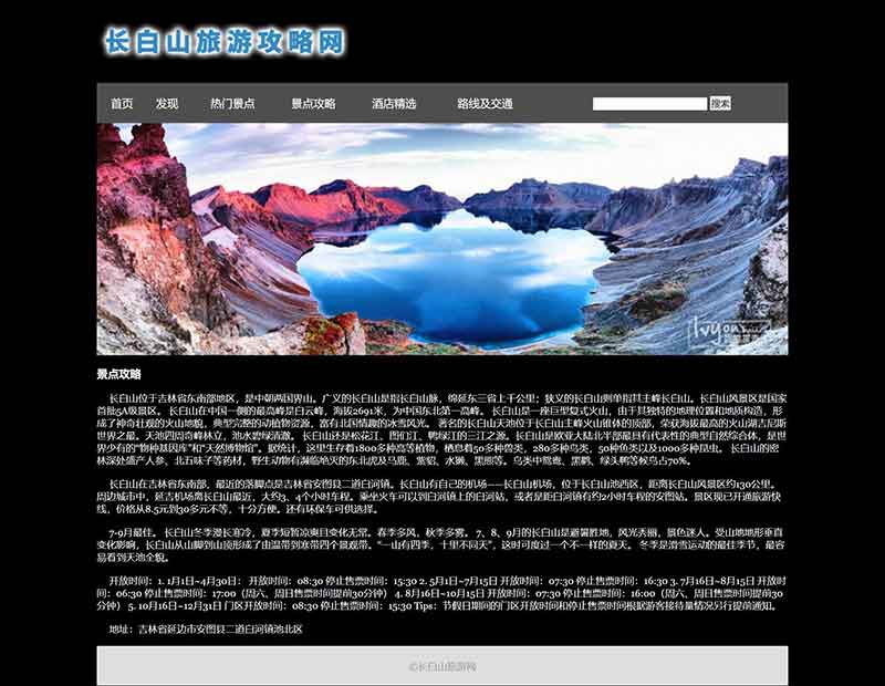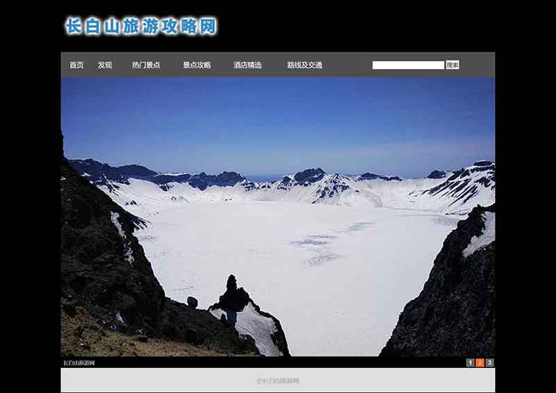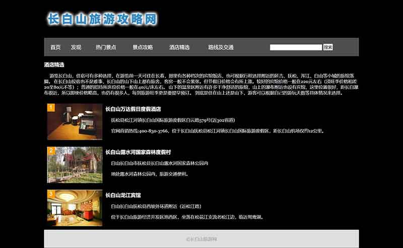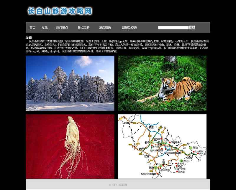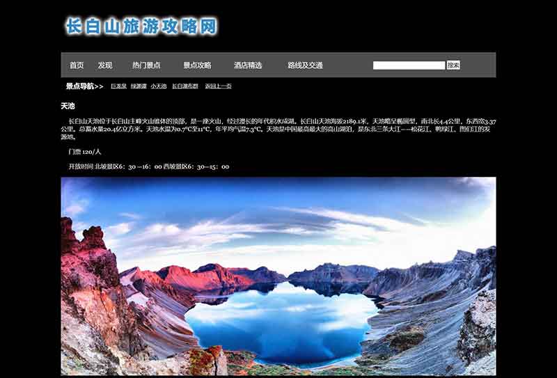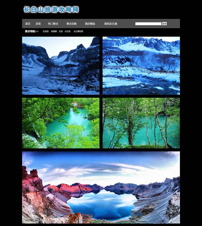 DW學生旅游景點HTML網頁設計作業-長白山旅游景點網頁設計作品采用表格布局,三層結構共12個頁面,包括首頁、介紹頁面、熱門景點頁面及對應5個景點介紹頁面、景點攻略頁面、酒店精選頁面、路線頁面、交通頁面。首頁使用JavaScript制作了大圖輪播,頁面加入了搜索表單功能,網頁設置了背景顏色。