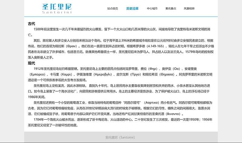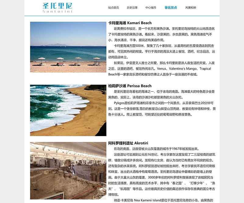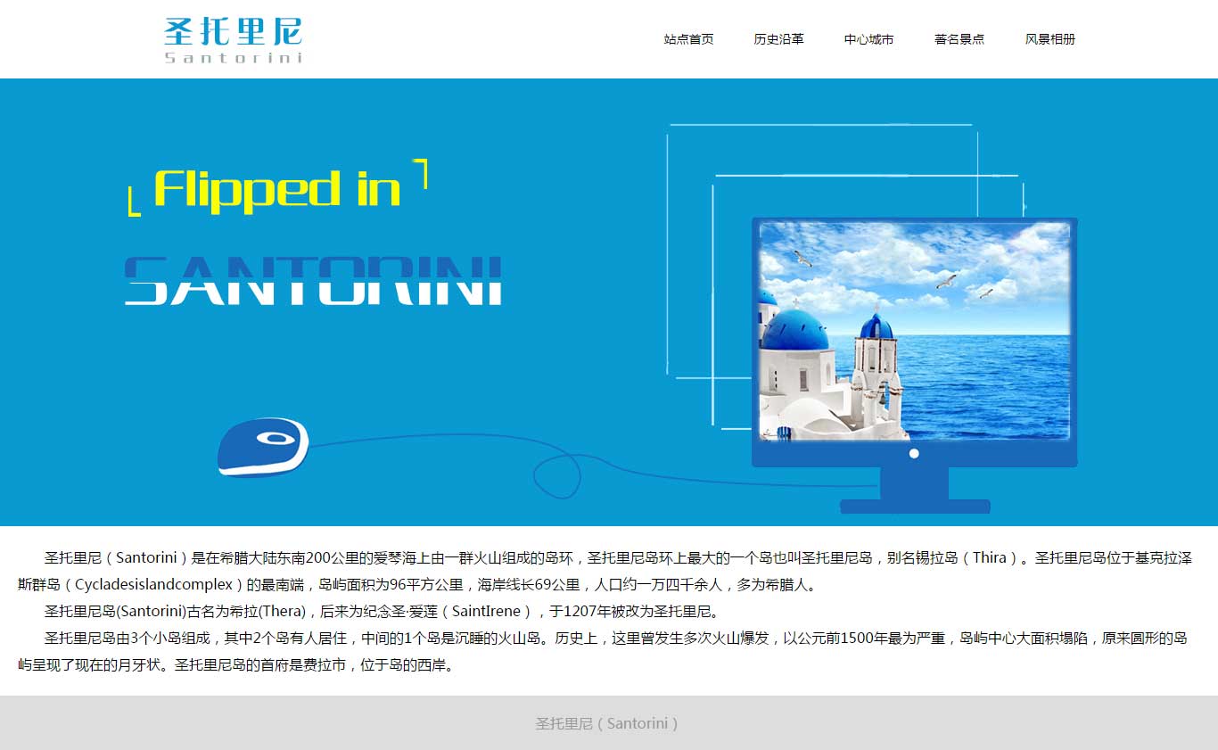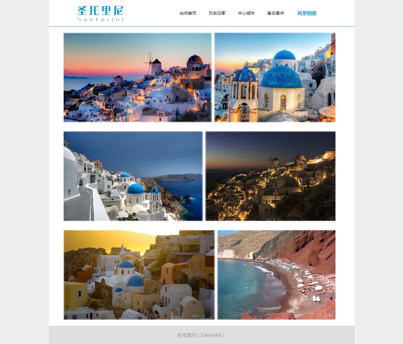 圣托里尼旅游景點(diǎn)類(lèi)大學(xué)生Dreamweaver網(wǎng)頁(yè)設(shè)計(jì)課程期末作品:共5個(gè)頁(yè)面,table布局,首頁(yè)大圖加入了鼠標(biāo)經(jīng)過(guò)行為,鼠標(biāo)經(jīng)過(guò)切換圖片,點(diǎn)擊大圖可前往子頁(yè)面。導(dǎo)航欄設(shè)置了鼠標(biāo)經(jīng)過(guò)效果及頁(yè)面選中效果。網(wǎng)頁(yè)設(shè)置了背景顏色。