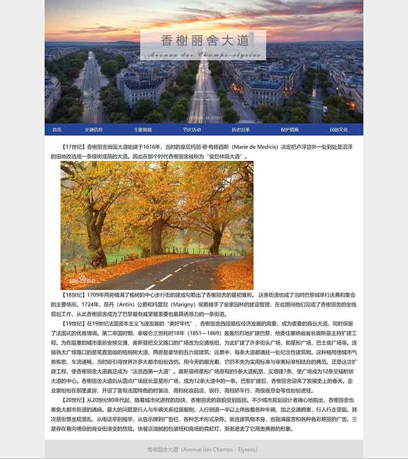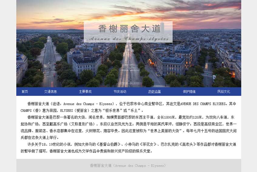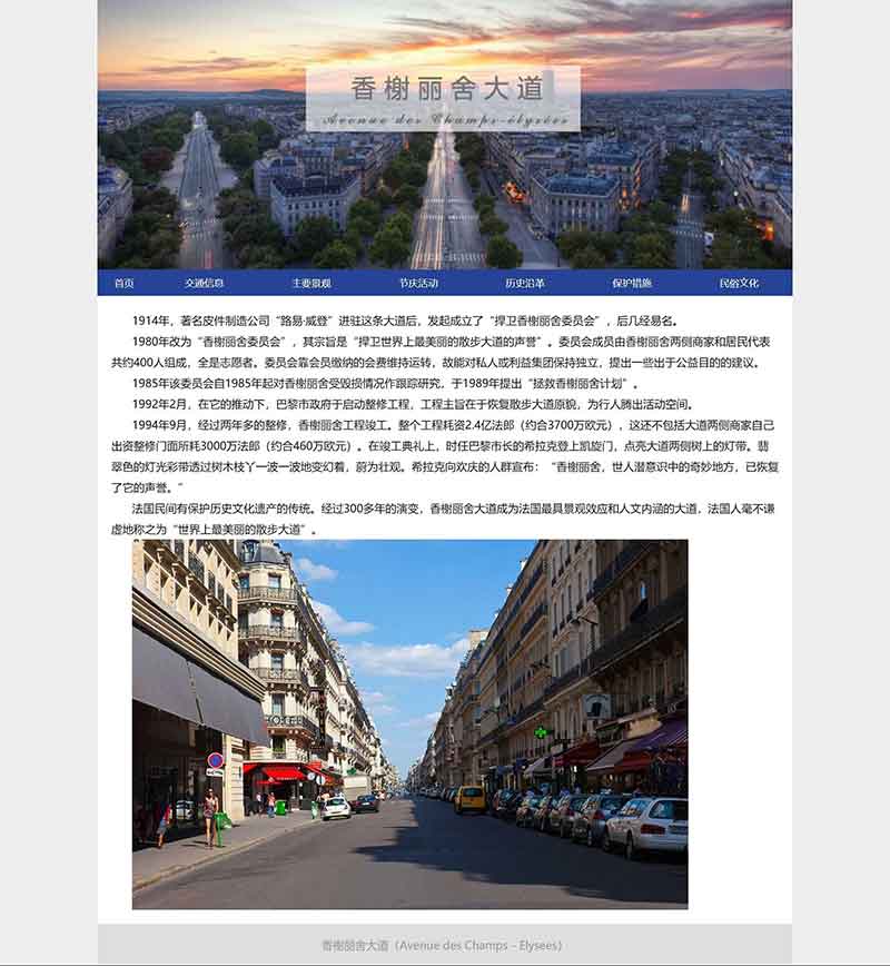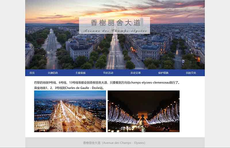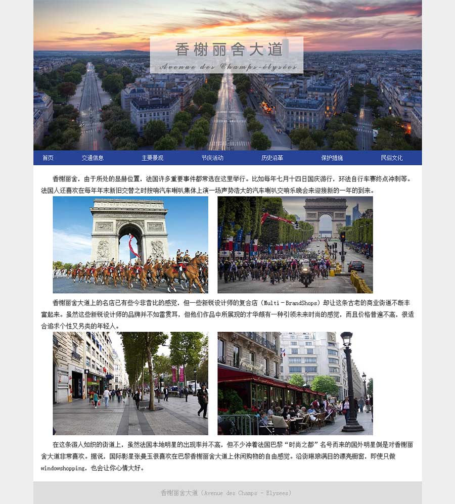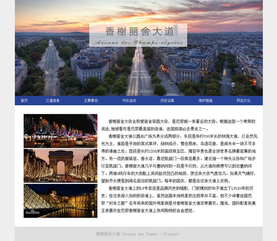 簡(jiǎn)單大學(xué)生旅游類網(wǎng)頁(yè)設(shè)計(jì)題材為法國(guó)巴黎旅游香榭麗舍大道景點(diǎn)介紹,使用Dreamweaver軟件采用TABLE表格布局制作,共7個(gè)頁(yè)面,網(wǎng)頁(yè)設(shè)計(jì)了背景顏色,有頭部、大圖、正文、底部。正文區(qū)域?yàn)槲淖只驁D文混排,無(wú)特效及復(fù)雜技術(shù)。