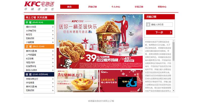 本網頁設計成品為1頁,仿肯德基宅急送外賣訂餐網站簡化制作的學生網頁作業,采用DIV CSS布局設計,頂部導航和左側的餐品二級導航使用CSS制作了鼠標經過變色效果,右側添加了手機號表單。無其他特殊技術。
