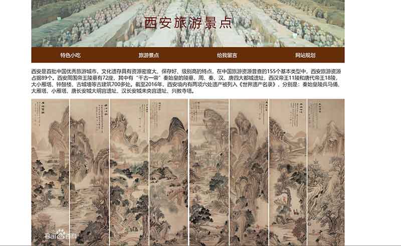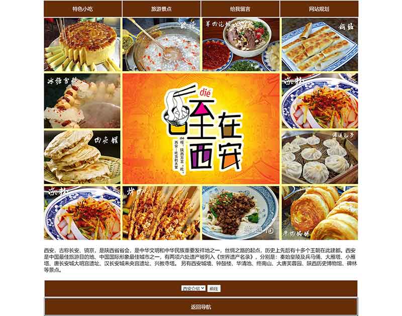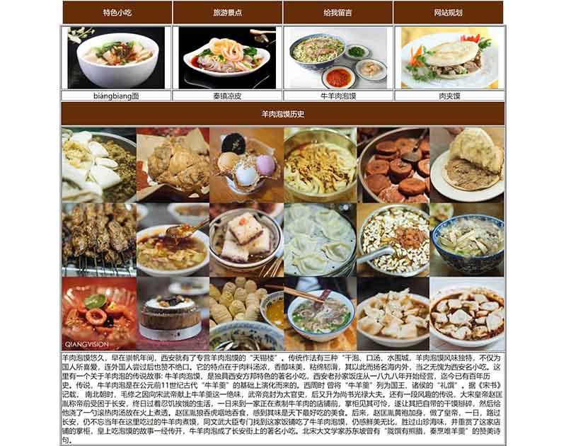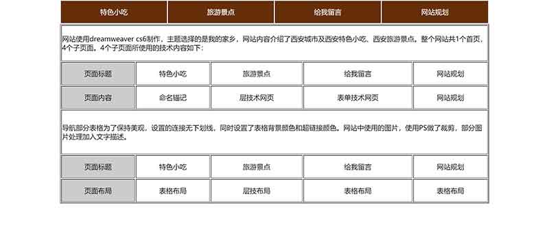 我的家鄉西安美食旅游大學生網頁設計作業作品使用dreamweaver采用表格布局制作完成,內容包括:層技術網頁、表單技術網頁、命名錨記的網頁、網站規劃書網頁。