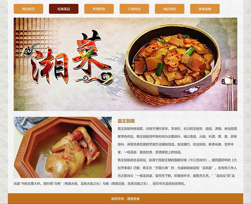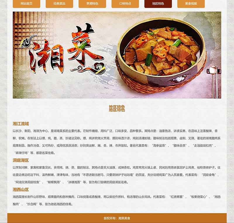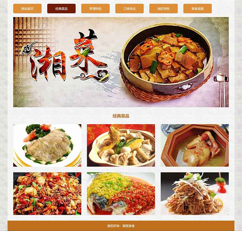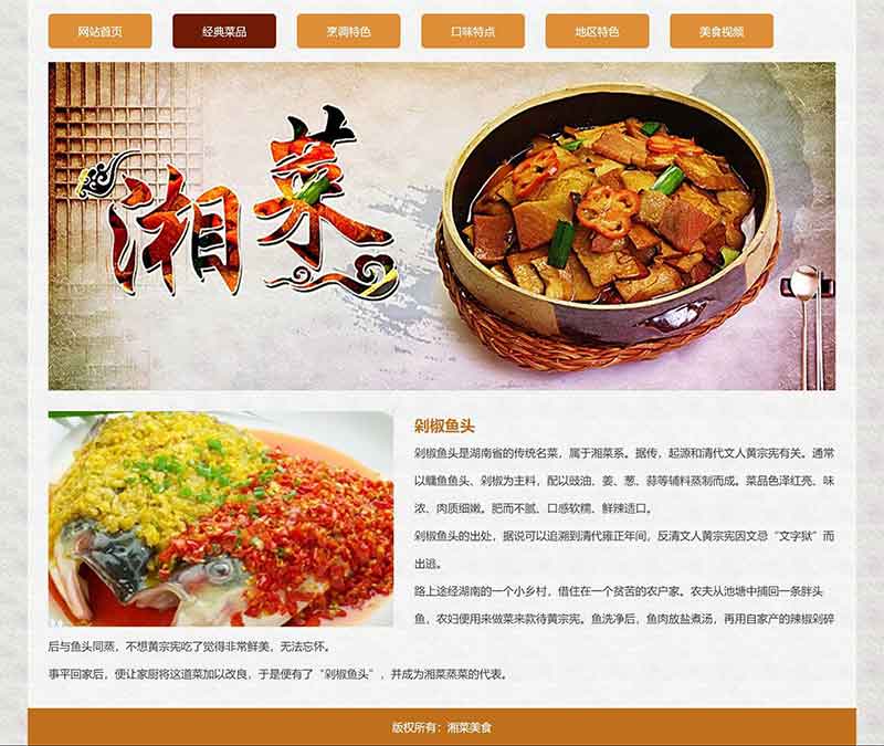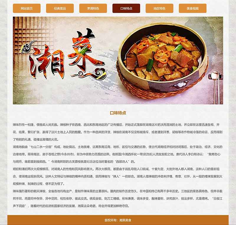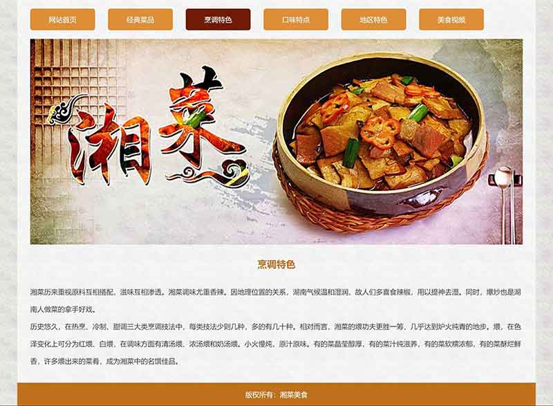 大學生HTML CSS網頁作業-湘菜美食網頁設計作品采用DIV CSS布局制作,三層結構共12頁,網頁內容主要包括網站首頁、經典菜品(此頁面下有6個介紹菜品的三級頁面)、烹調特色、口味特點、地區特色、美食視頻。