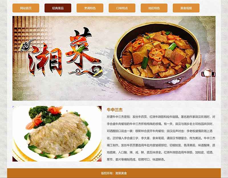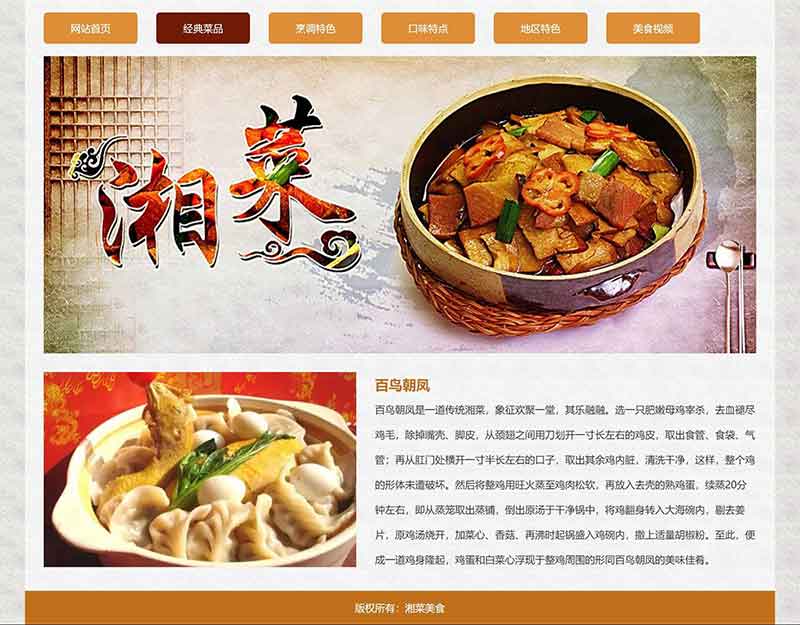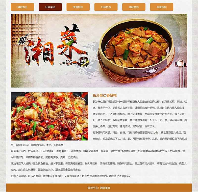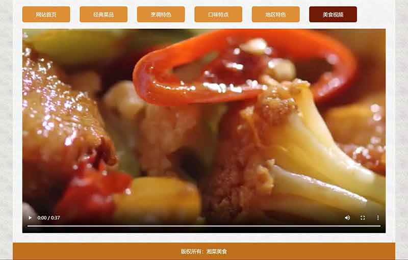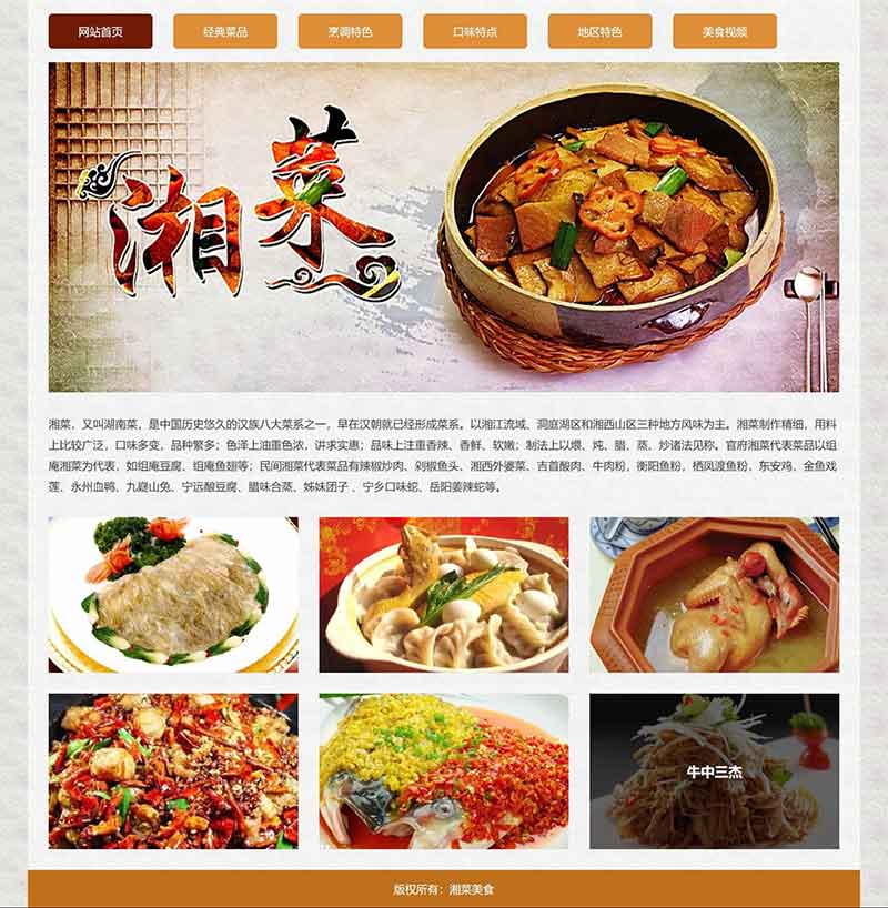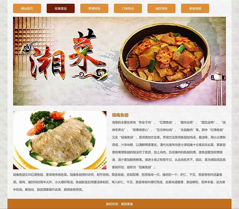大學生HTML CSS網頁作業-湘菜美食網頁設計作品采用DIV CSS布局制作,三層結構共12頁,網頁內容主要包括網站首頁、經典菜品(此頁面下有6個介紹菜品的三級頁面)、烹調特色、口味特點、地區特色、美食視頻。