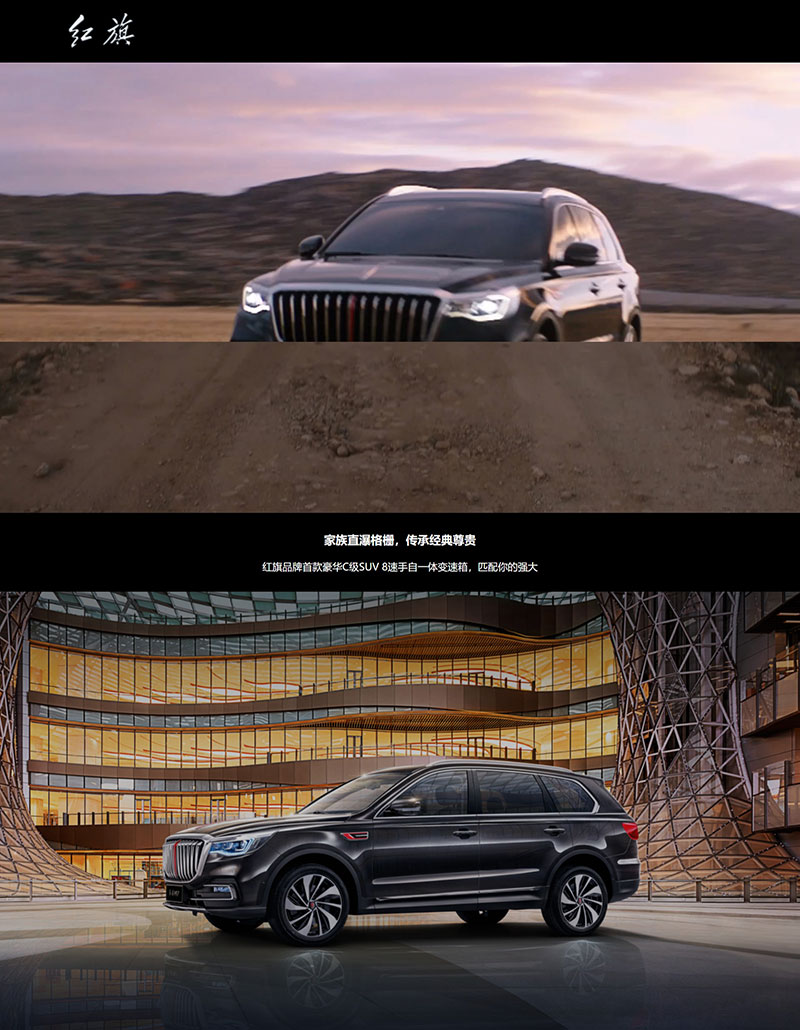 首頁為大圖加四個最新車型圖片,點(diǎn)擊車型圖可進(jìn)入對應(yīng)的詳情子頁面。進(jìn)入子頁面后頂部視頻自動播放,整個作品共4個視頻文件,每個子頁面頂部都插入了對應(yīng)的車型視頻、文案、海報圖,簡單酷炫。