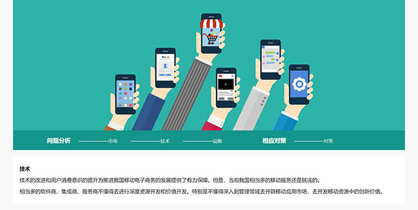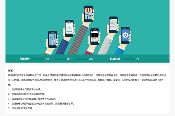 網(wǎng)頁設(shè)計作品十分簡單,共4個頁面,主題為我國移動電子商務(wù)發(fā)展的問題分析與對策,采用DIV CSS布局制作。4個頁面僅內(nèi)容不同,結(jié)構(gòu)相同。頁面整體寬度1200像素,按網(wǎng)頁內(nèi)容劃分為問題分析和相應(yīng)對策,制作了導(dǎo)航樣式,學(xué)生入門級網(wǎng)頁設(shè)計代碼作品。