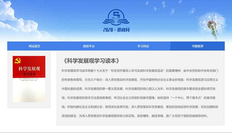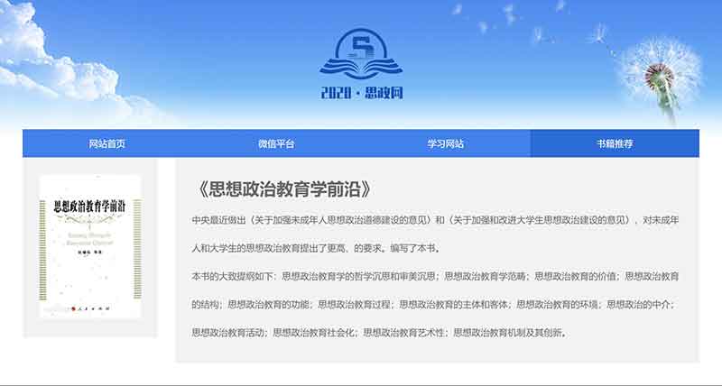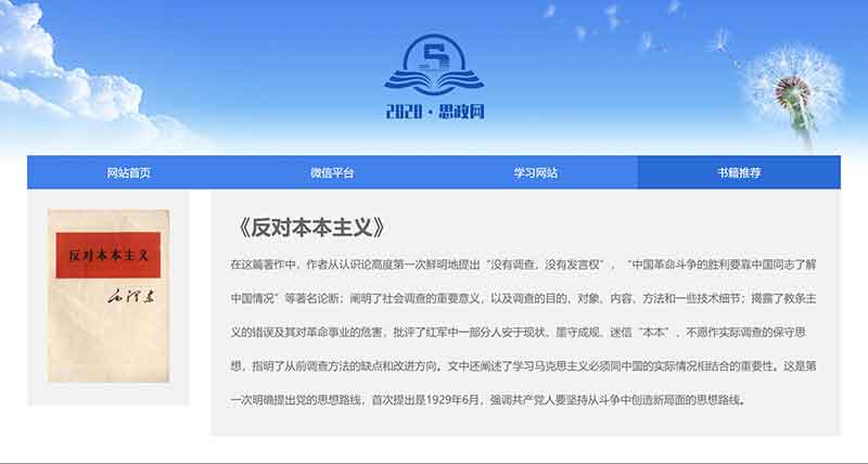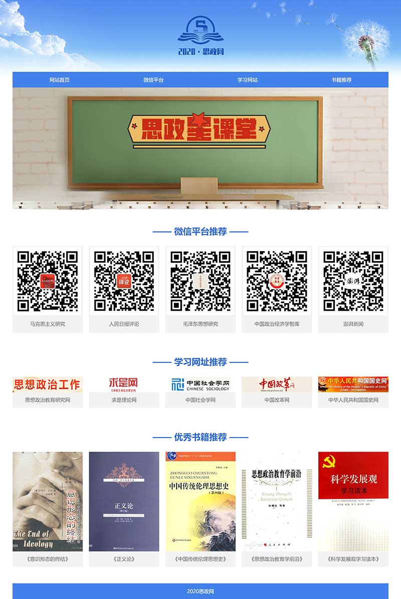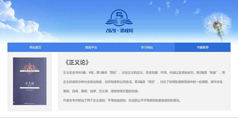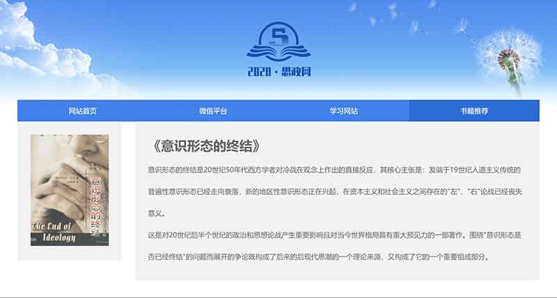 思政網頁設計學生作品使用DIV CSS制作,共10個頁面,包括:首頁、微信平臺推薦欄目、學習網站推薦欄目、學習書籍推薦欄目 以及 六個書籍介紹三級頁面。