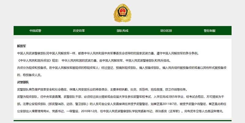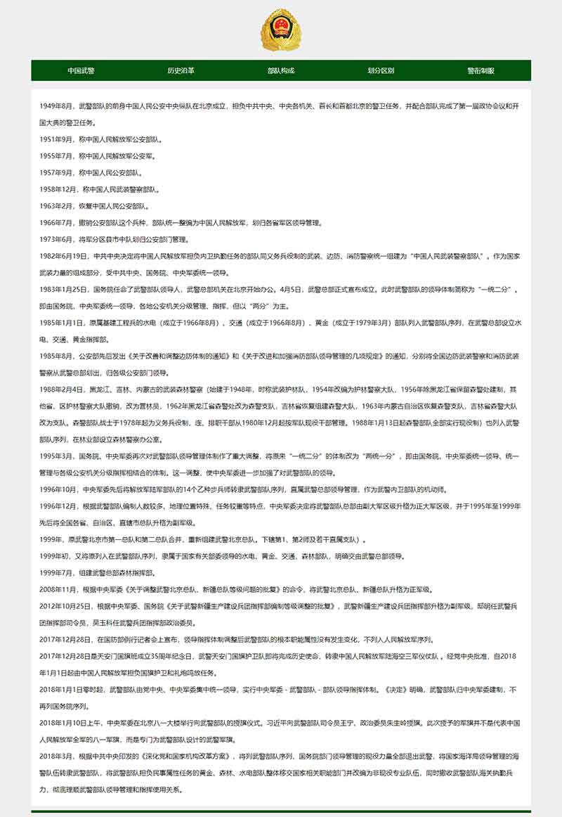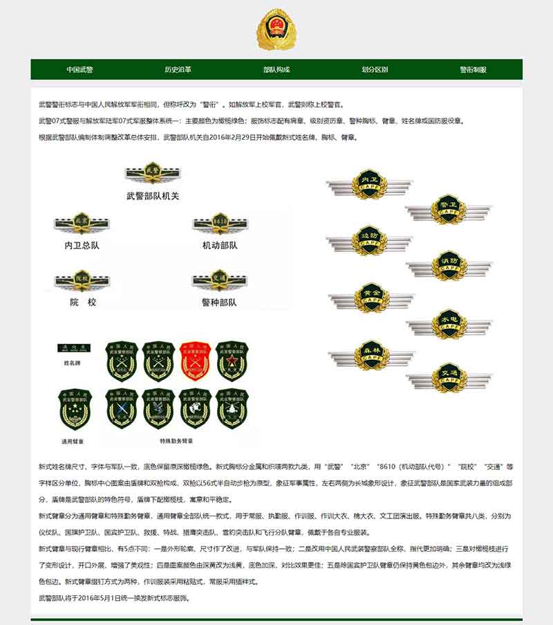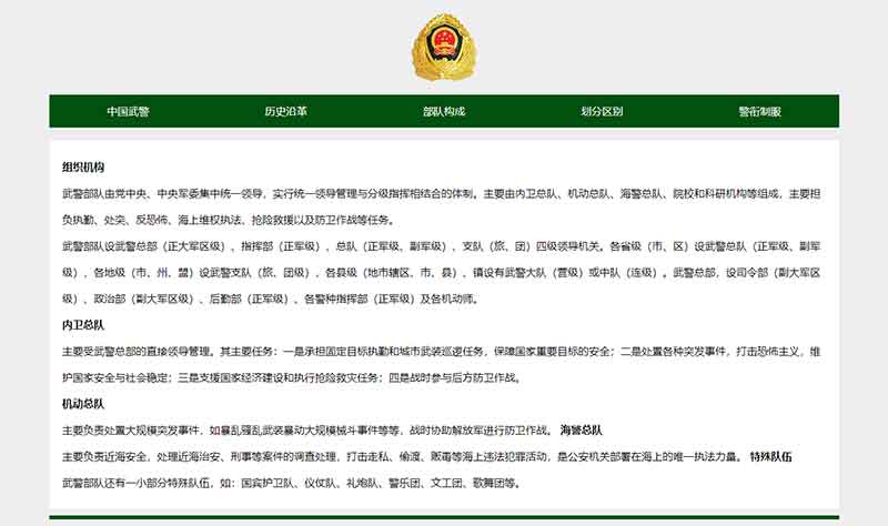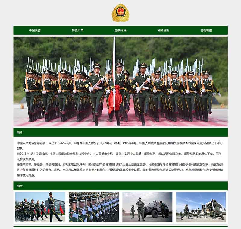 大學生軍事愛國題材網頁設計作品以中國武警為主題,資料收集于百度百科,網頁中內容包括我國武警歷史、構成、劃分及制服介紹。網頁采用DIV+CSS布局,使用css在導航部分制作了鼠標經過顏色變化特效,設置了網頁背景顏色,排版結構合理,有LOGO、導航、BANNER、文字區域、圖片列表區域。代碼技術簡單。