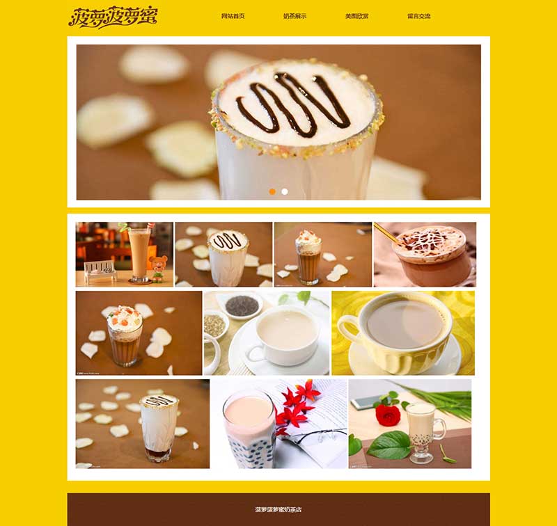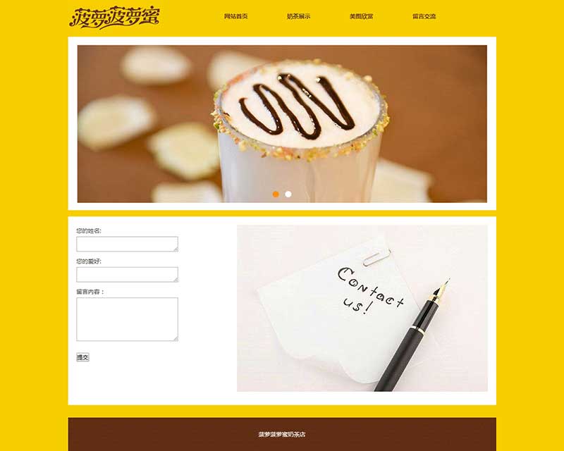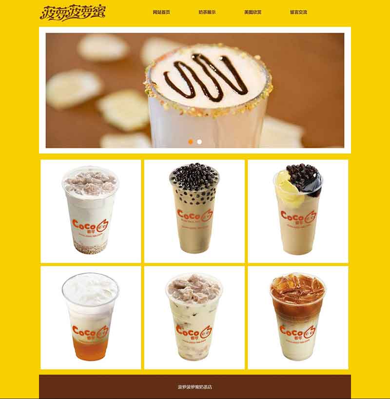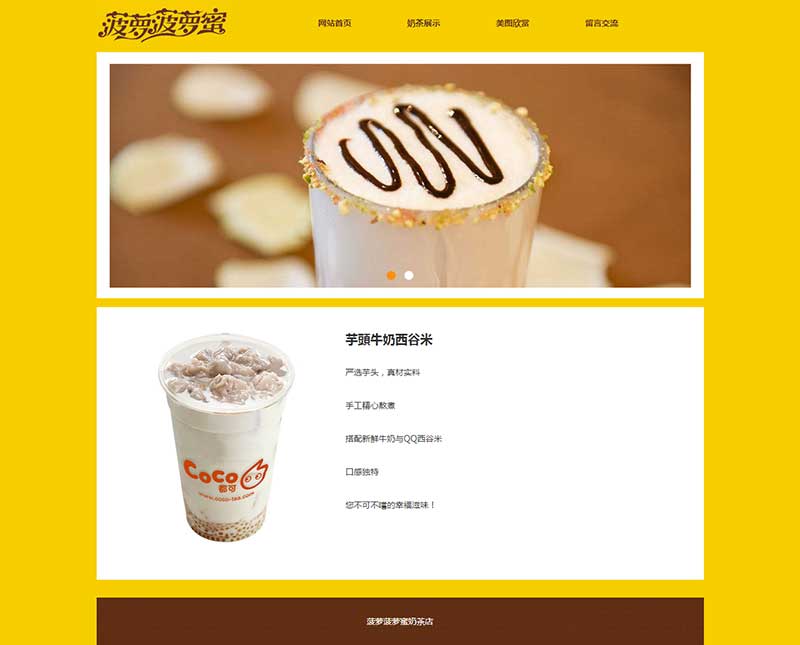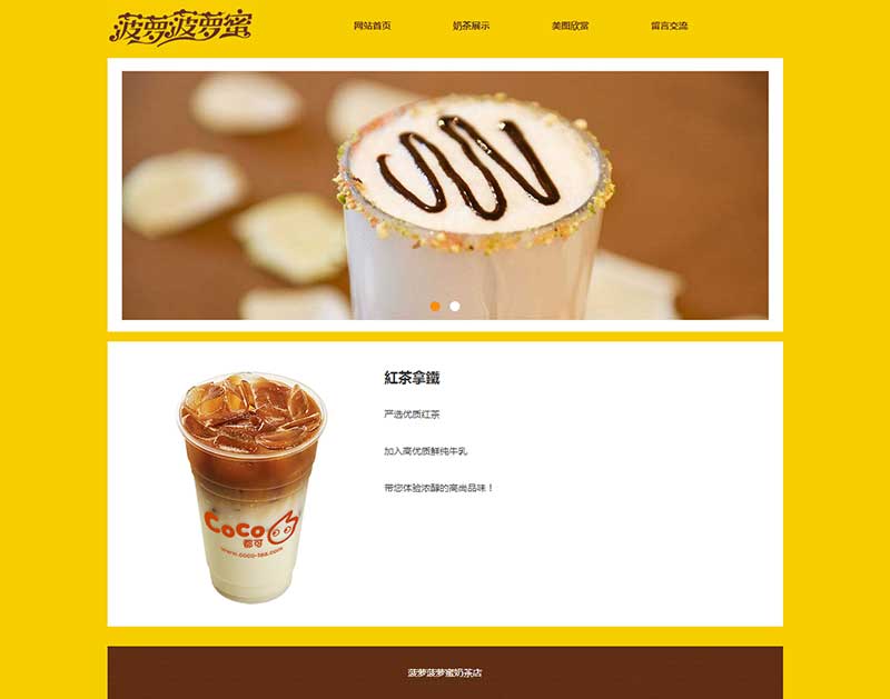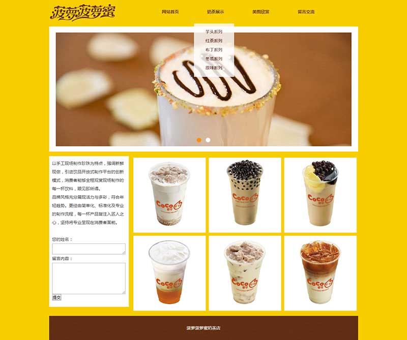 大學生靜態HTML奶茶網頁設計作品由DIV+CSS布局制作,作品共9個頁面,三層結構,包括1個首頁、3個二級頁面、5個三級頁面。網頁頂部輪播圖效果使用jquery制作,下拉菜單使用js制作,另外表單頁面提交按鈕添加了JavaScript提交彈窗提示,子頁面排版布局均單獨制作。整個作品比較完善,細節處理到位。
