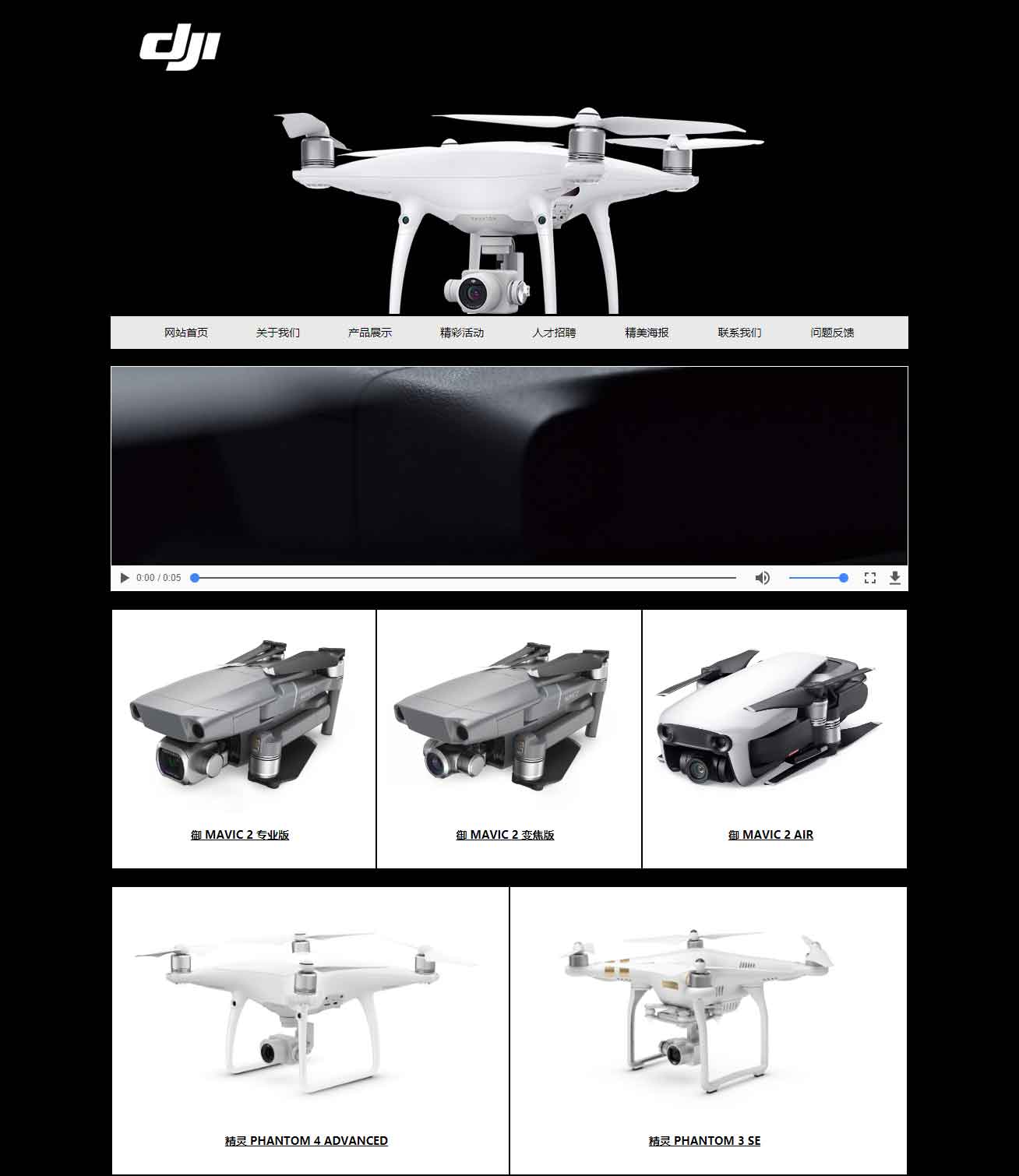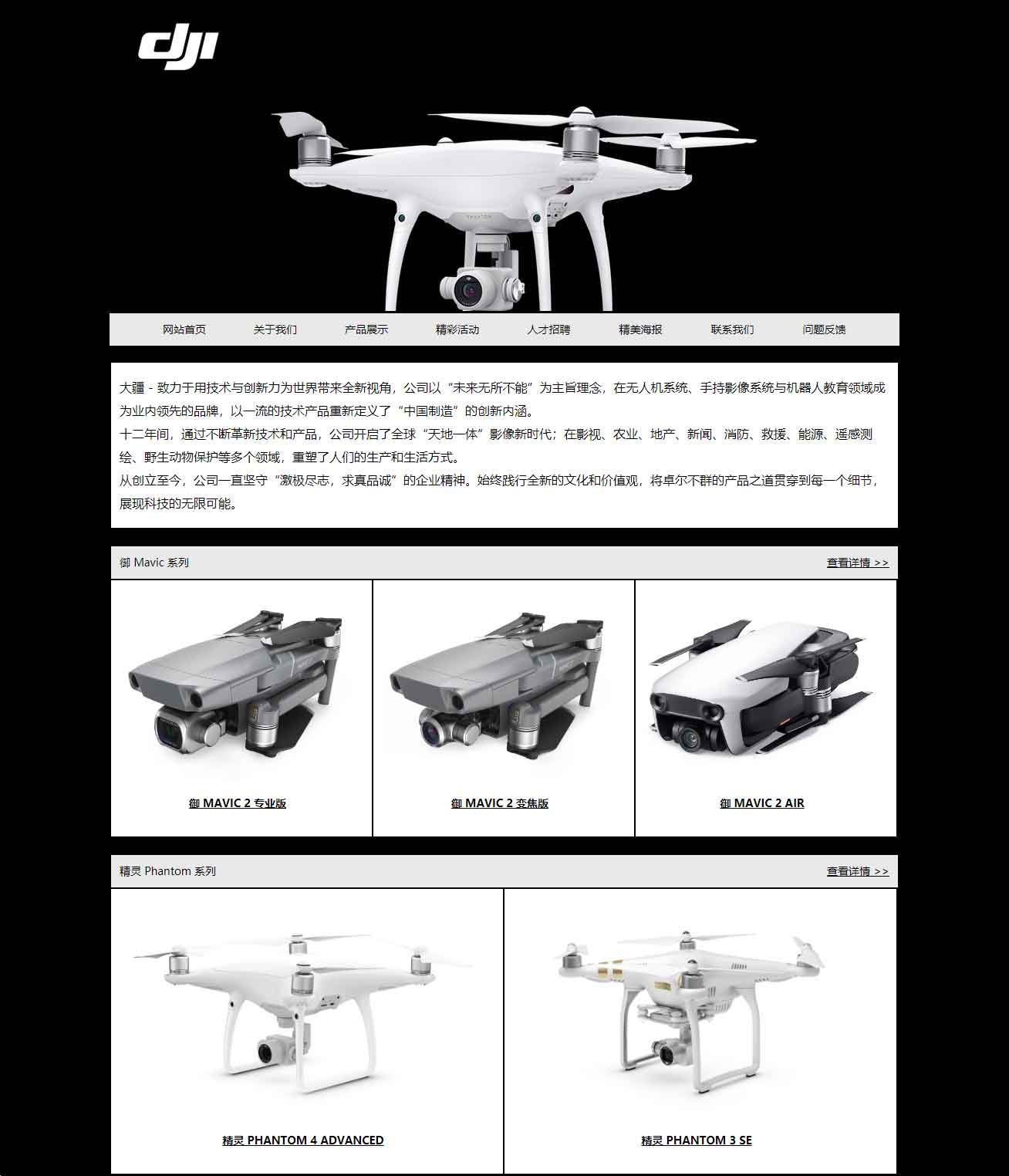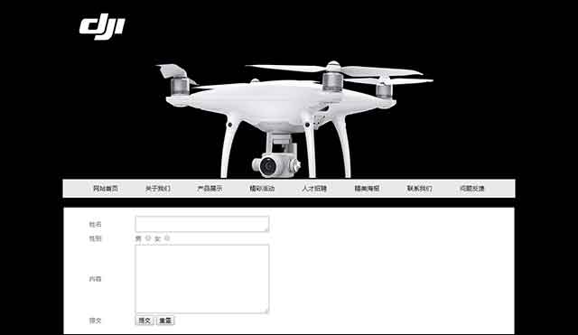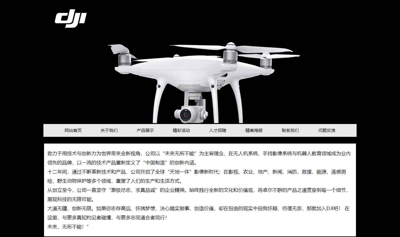 科技公司企業大疆無人機網頁作品主題,使用Table表格布局制作,共15個頁面,有三級子頁面及留言表單頁。