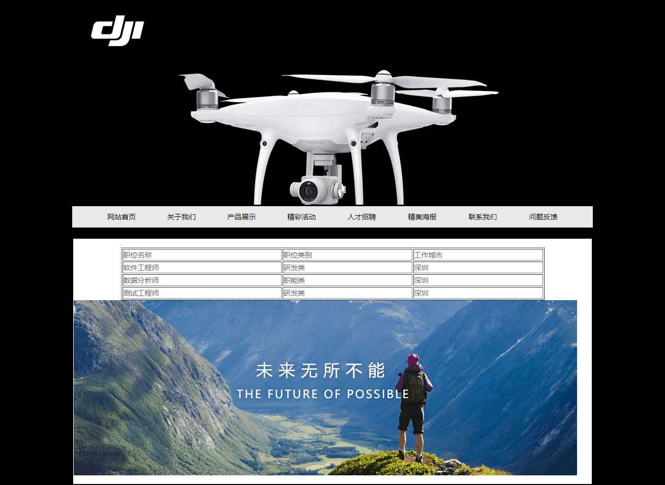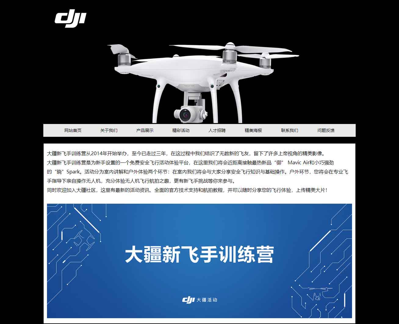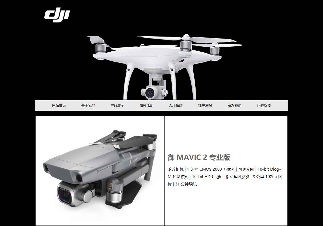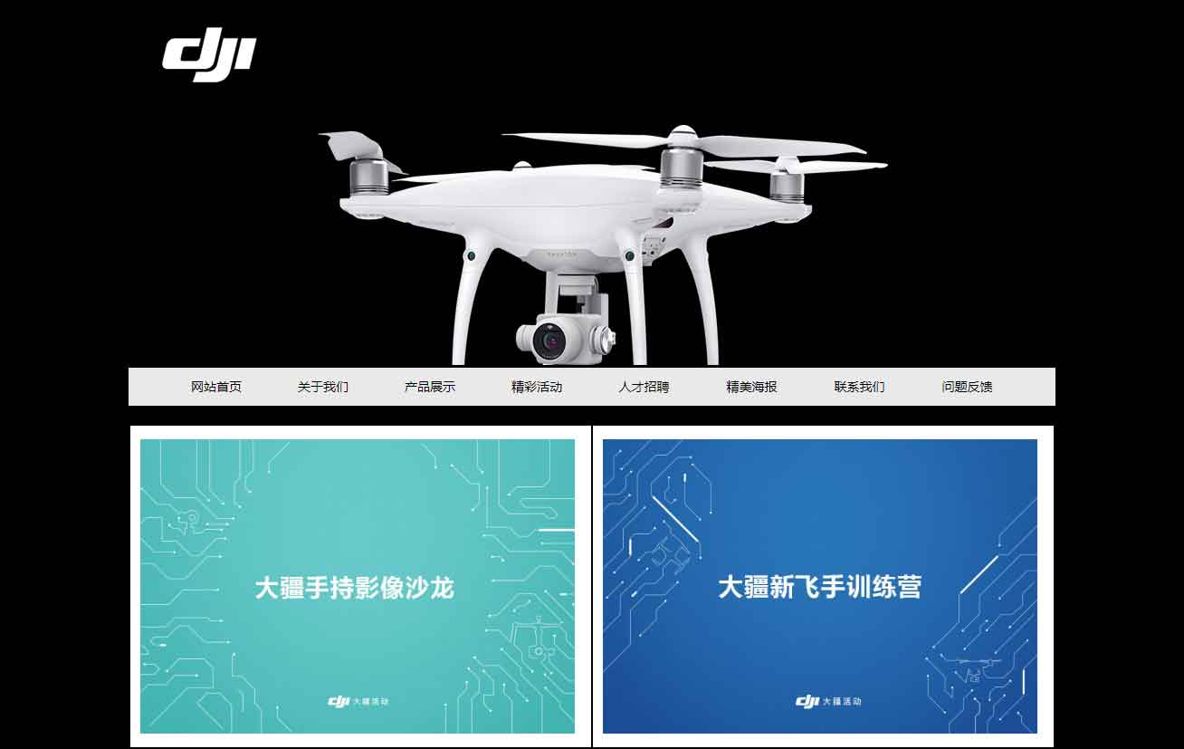 科技公司企業大疆無人機網頁作品主題,使用Table表格布局制作,共15個頁面,有三級子頁面及留言表單頁。