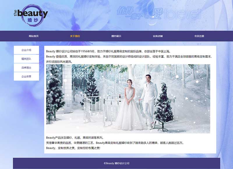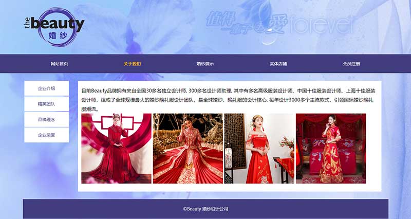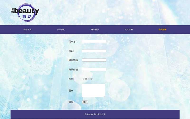 大學(xué)生婚紗品牌企業(yè)網(wǎng)頁設(shè)計作品技術(shù)點包含三層結(jié)構(gòu)、網(wǎng)頁背景圖、音樂 Flash 滾動文字、表單、行為、Flash、導(dǎo)航鼠標(biāo)經(jīng)過及選中效果等。本網(wǎng)頁使用dreamwearver制作,采用table表格布局,主題為婚紗設(shè)計企業(yè)。共8個頁面,首頁1個,二級頁面4個(含注冊表單頁面),三級頁面3個。