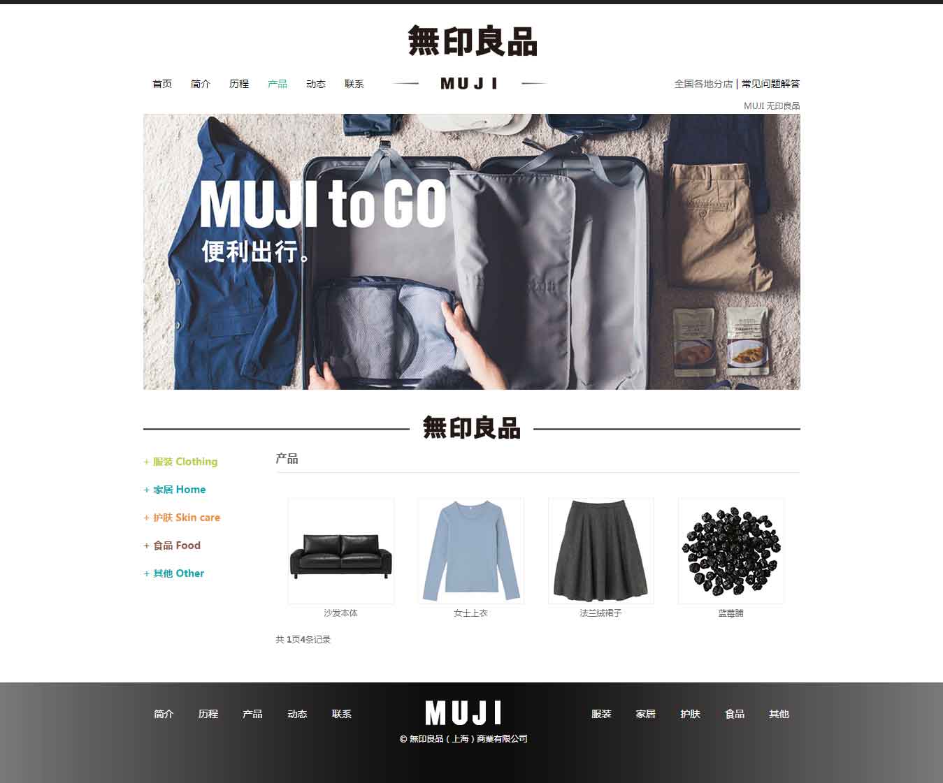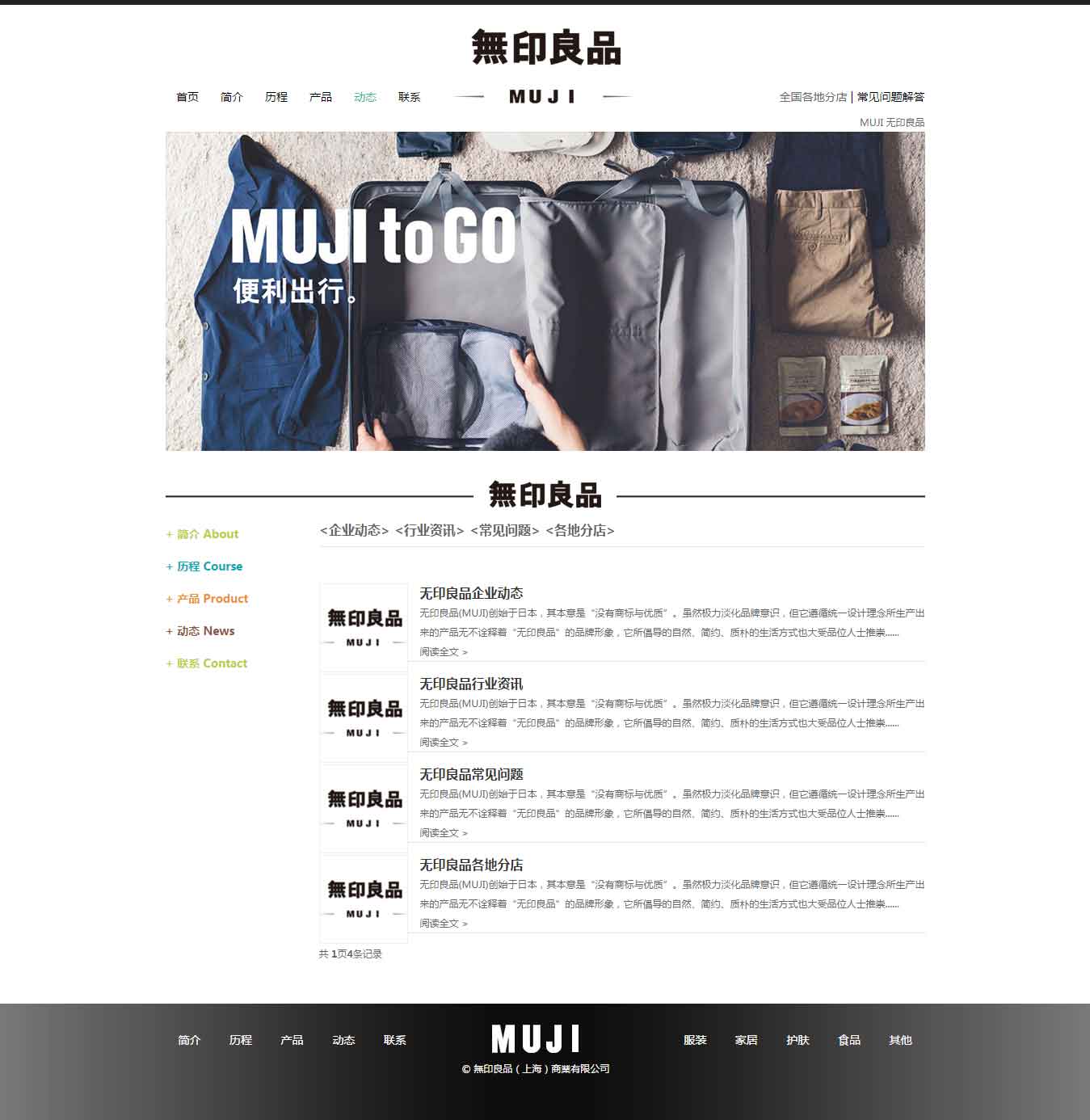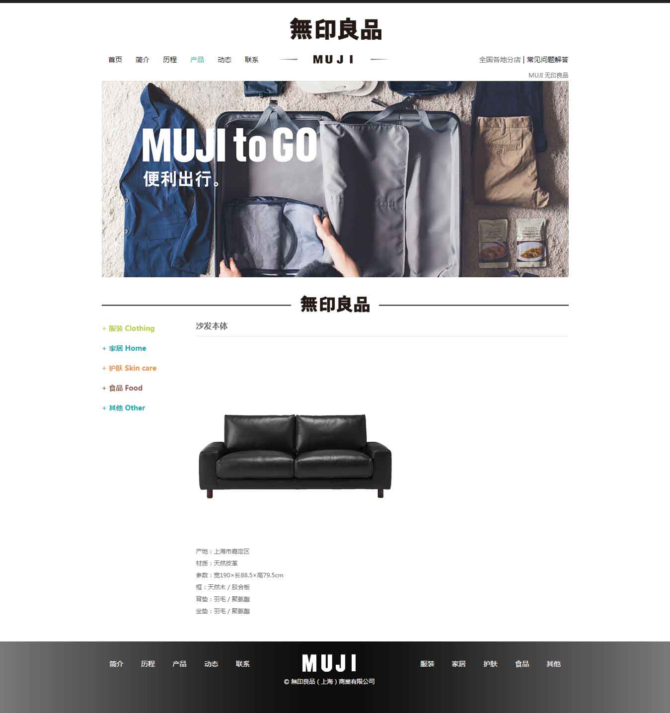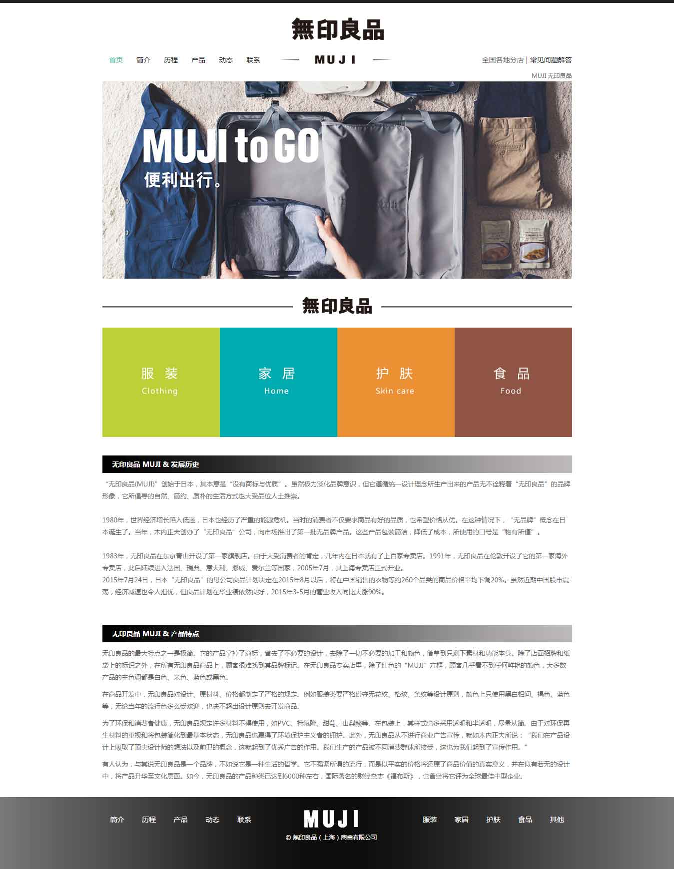 無印良品MUJI網(wǎng)站制作,學生作業(yè)網(wǎng)頁設計,大學生作業(yè)企業(yè)網(wǎng)站設計模板作品共11個頁面,其中包括1個首頁、5個二級頁面、5個三級頁面。頁面精美素材漂亮,三層結構,DIV CSS布局制作,導航欄制作了鼠標經(jīng)過及選中效果,代碼稍復雜。