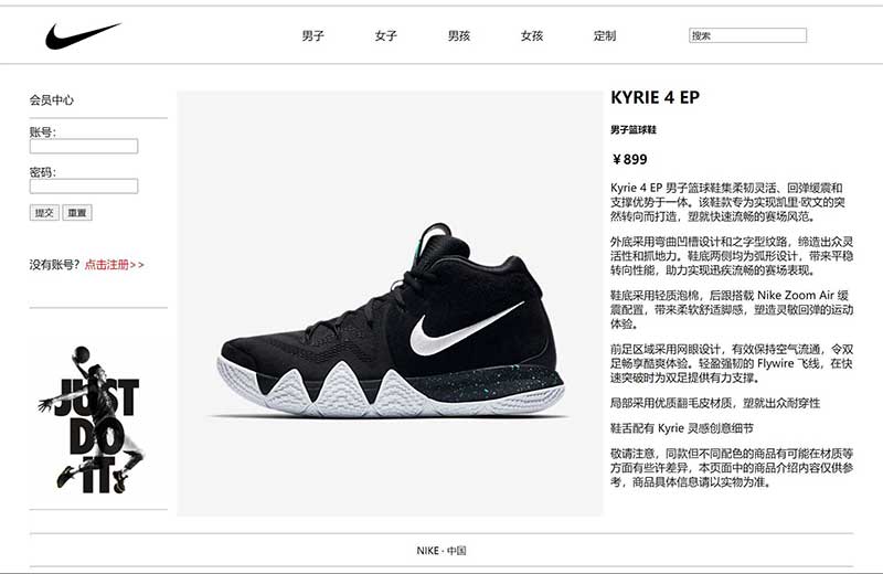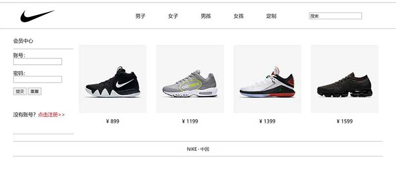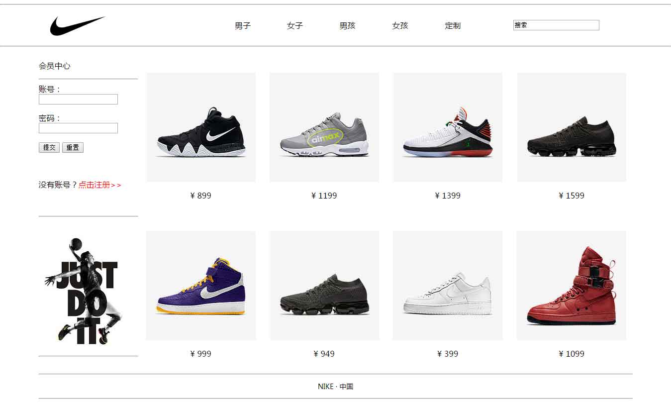 電子商務(wù)類型的參考NIKE官網(wǎng)制作的簡版商城,首頁有登錄、搜索表單,有注冊頁面。頁面干凈簡單,使用技術(shù)為最基礎(chǔ)的table表格布局制作,三層結(jié)構(gòu),頁面數(shù)量共15頁,包括1個首頁、4個二級列表頁面、1個圖片專業(yè)頁面、8個鞋子介紹三級頁面,點擊LOGO可以返回首頁。