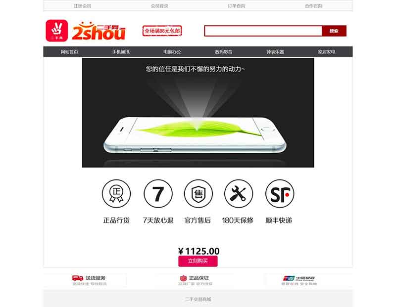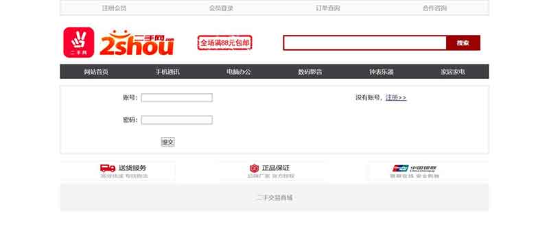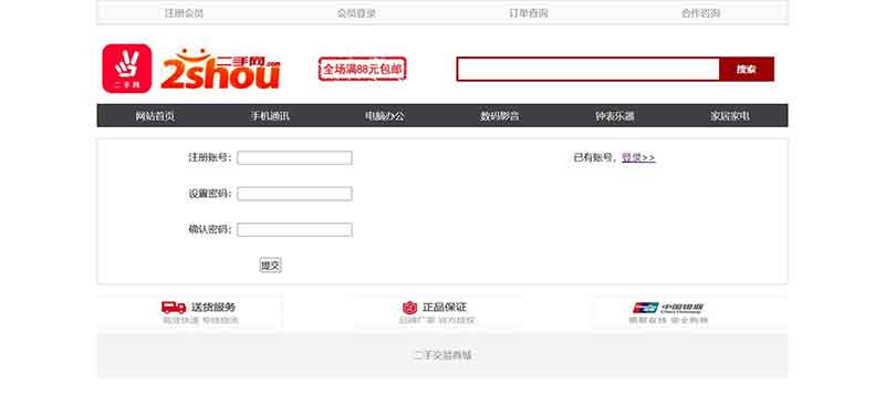 二手交易商城( 電子商務網上商城)網頁制作作品模板使用Dreamweaver采用TABEL表格布局制作,共4頁,有首頁、注冊頁面、登錄頁面、商品詳情頁面。應用多種超鏈接形式(超鏈接、錨點、空鏈接),有表單。頁面布局簡潔干凈,技術代碼簡單。