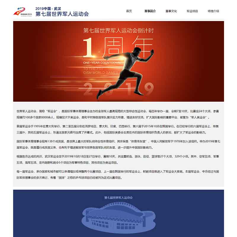 作品題材為第七屆世界軍人運動會學生網頁設計制作,作品共5頁,使用div css制作,首頁使用JavaScript制作了輪播圖,輪播圖下方加入了滾動文字。