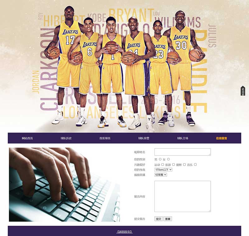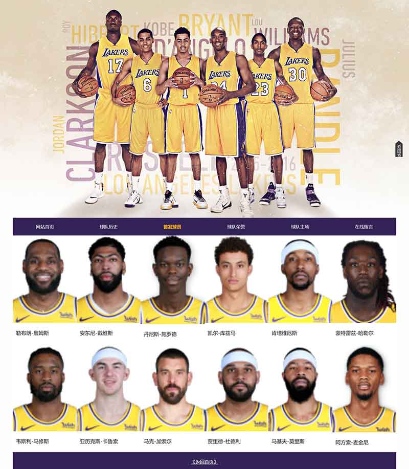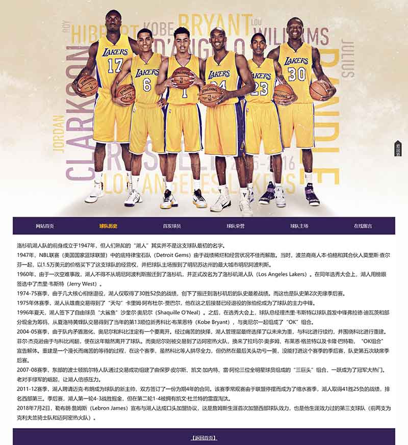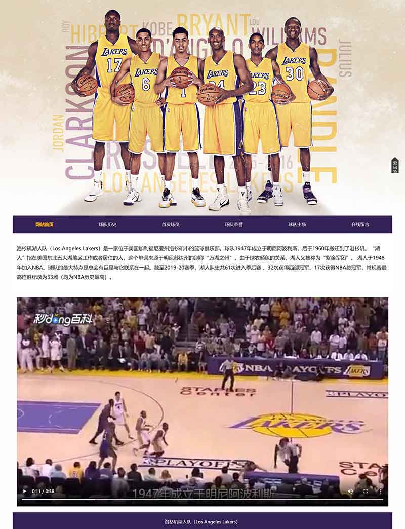 大學(xué)生NBA網(wǎng)頁(yè)靜態(tài)HTML運(yùn)動(dòng)題材網(wǎng)站題材選用洛杉磯湖人隊(duì)為主題,網(wǎng)頁(yè)設(shè)計(jì)使用dreamweaver采用table表格布局制作,共6個(gè)頁(yè)面,頁(yè)面插入了網(wǎng)頁(yè)背景音樂,首頁(yè)插入了視頻,資料豐富完善,色彩及頁(yè)面布局合理,有導(dǎo)航、Banner、正文、腳部區(qū)。整體為大學(xué)生網(wǎng)頁(yè)作業(yè)水平制作。