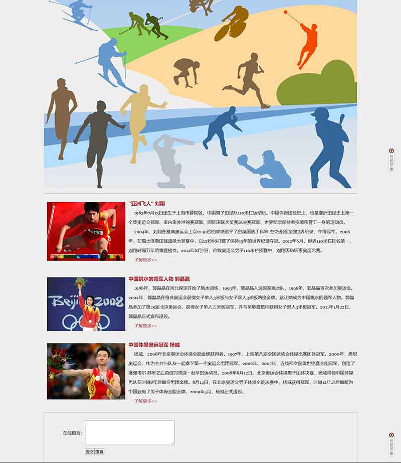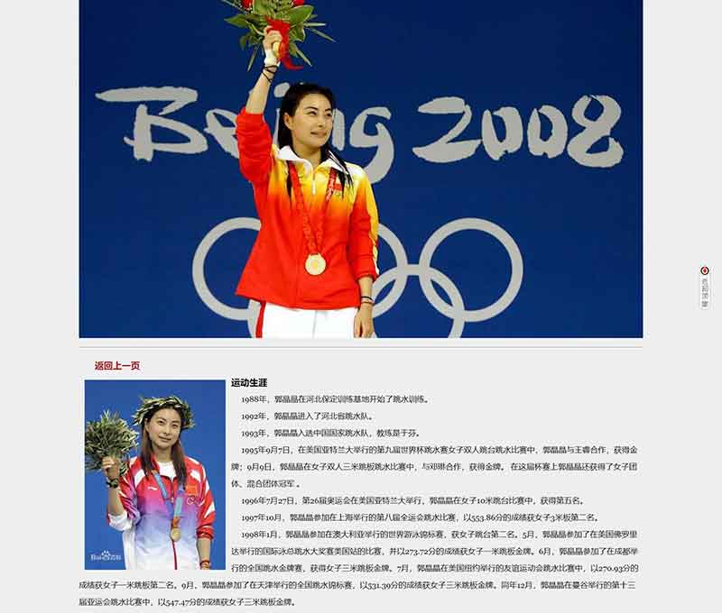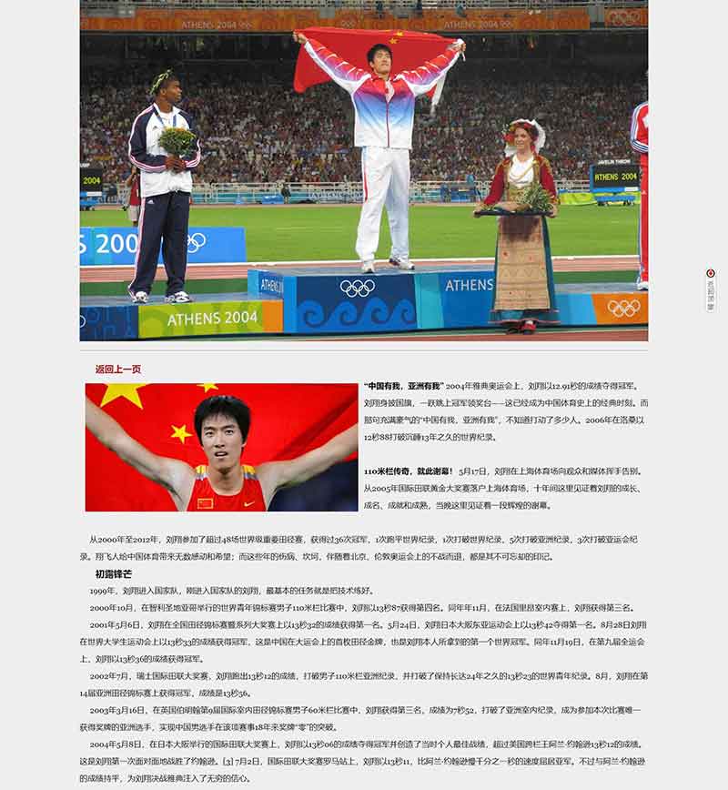 DW奧運(yùn)運(yùn)動(dòng)員網(wǎng)頁設(shè)計(jì)作品,HTML大學(xué)生網(wǎng)頁設(shè)計(jì)作業(yè)制作成品作品說明:共計(jì)4個(gè)頁面,頁面精美,首頁是列表頁面,每個(gè)單獨(dú)的人物詳情頁面都有單獨(dú)的大圖。可直接上交。