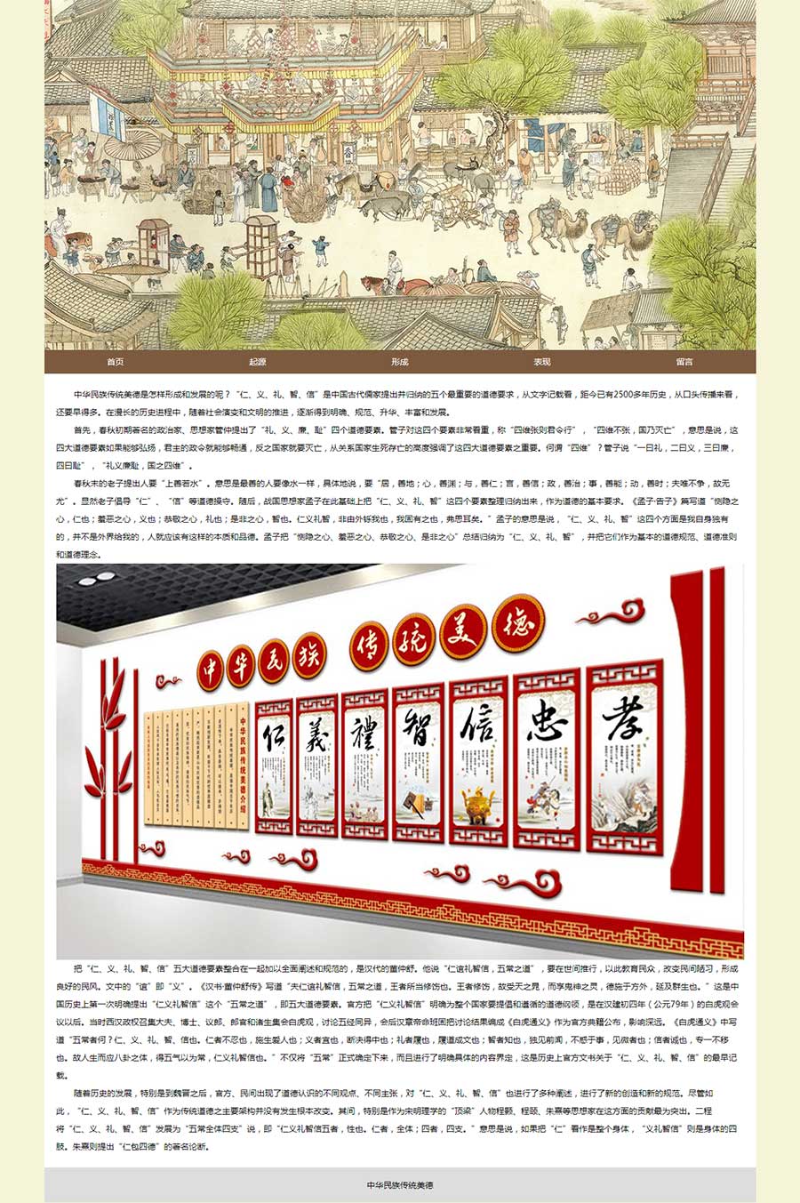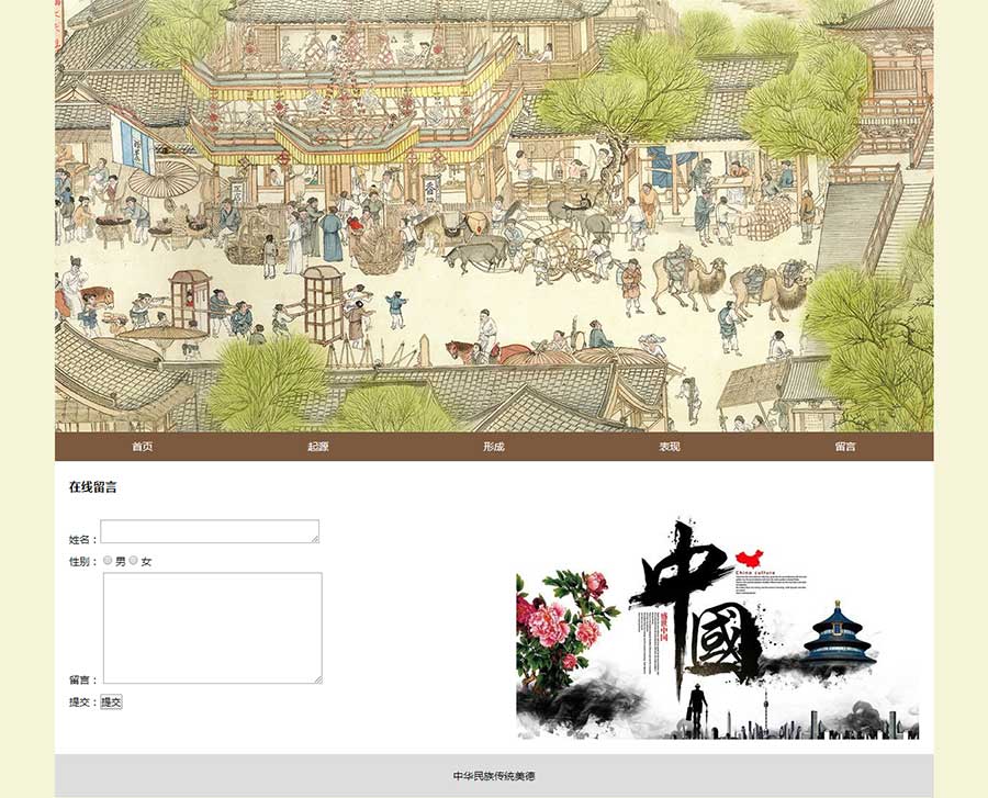 本作品是使用Dreamweaver采用表格排版布局制作的關于介紹中華民族傳統美德的網頁作品,作品有5個網頁,包括首頁、起源、形成、表現、留言,其中留言為表單頁面。技術使用比較簡單,內容豐富。