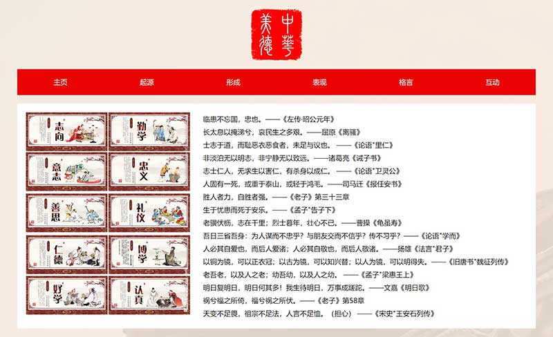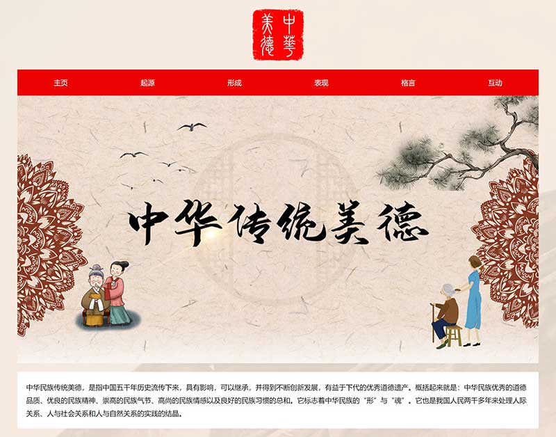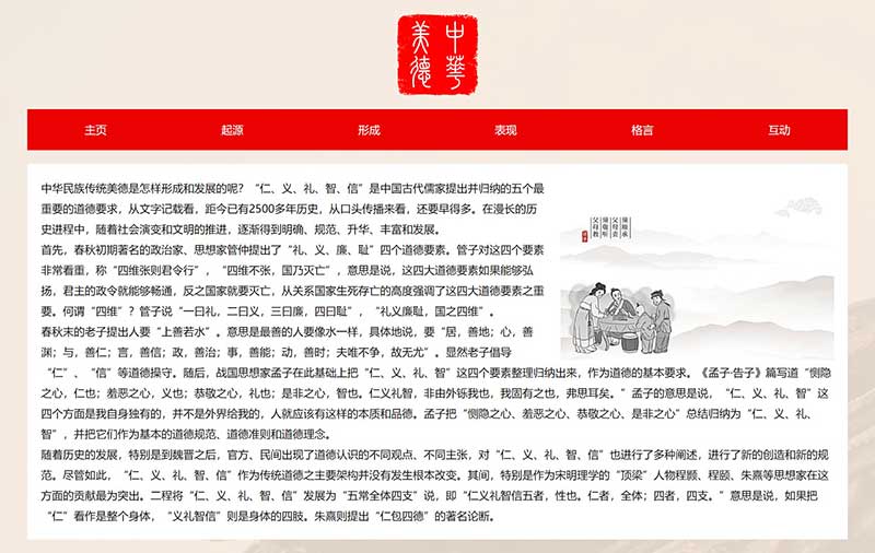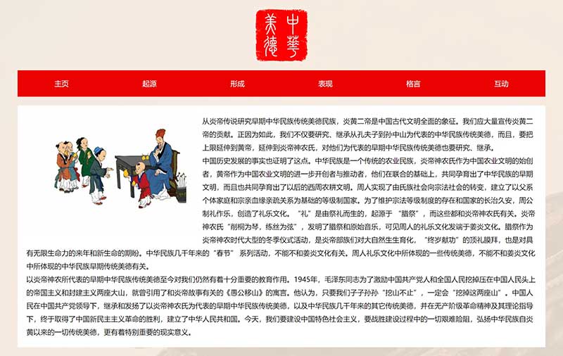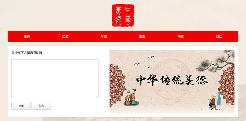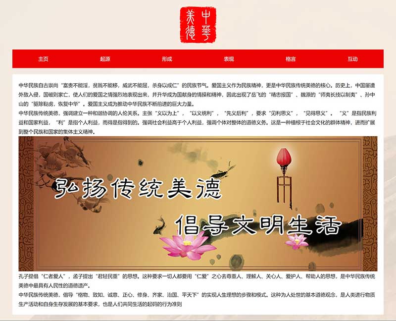 中華民族傳統(tǒng)美德題材學(xué)生靜態(tài)網(wǎng)頁制作作品采用DIV CSS布局設(shè)計(jì)制作,作品共6個(gè)頁面:主頁、起源、形成、表現(xiàn)、格言、留言。網(wǎng)頁設(shè)計(jì)采用學(xué)生基礎(chǔ)水平制作,制作了留言表單頁面同時(shí)插入了網(wǎng)頁背景音樂和網(wǎng)頁背景圖片。