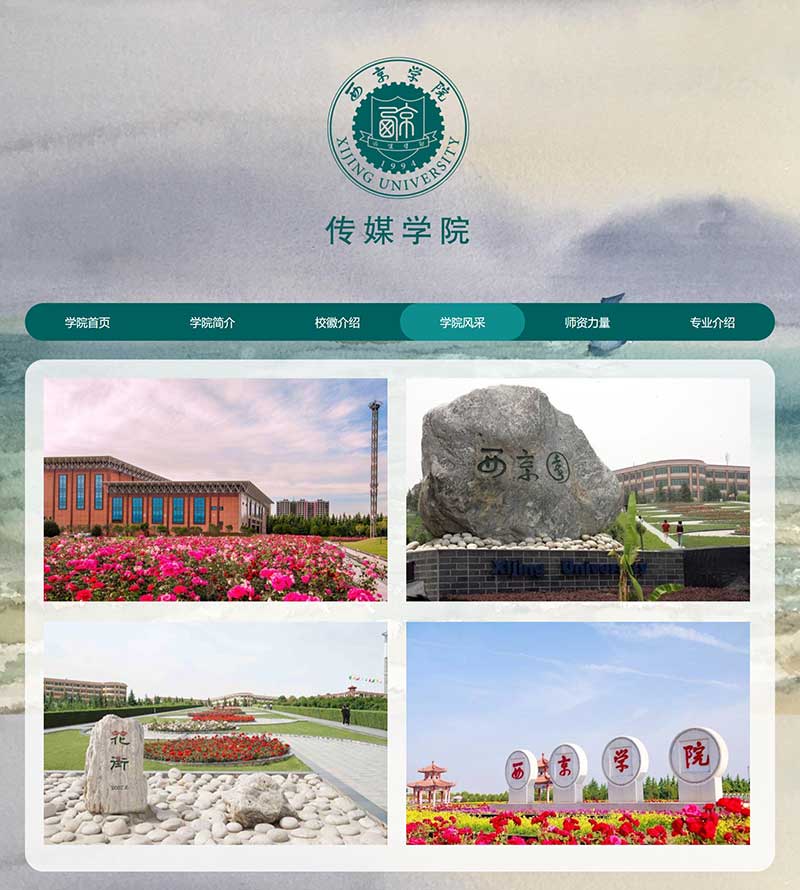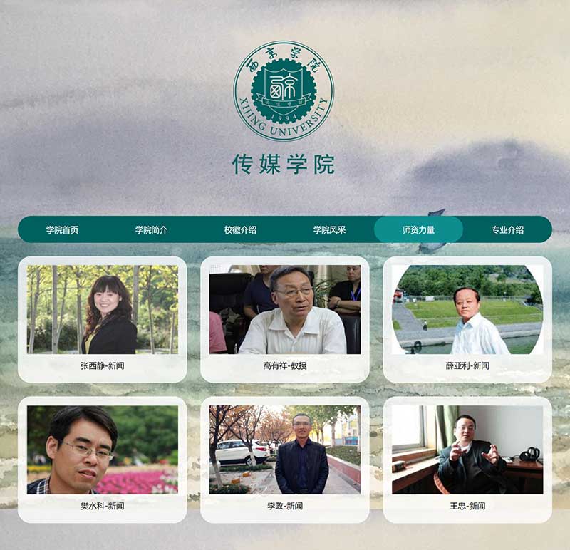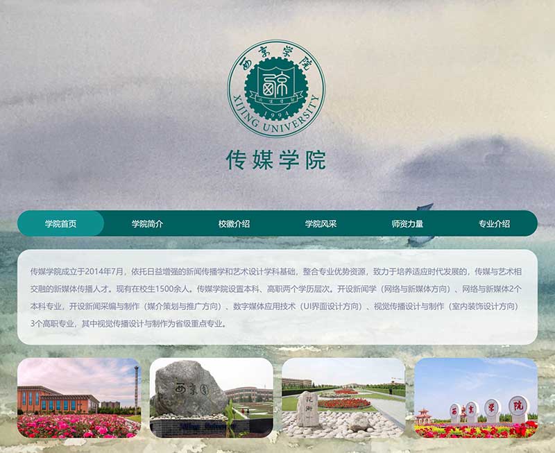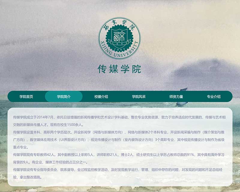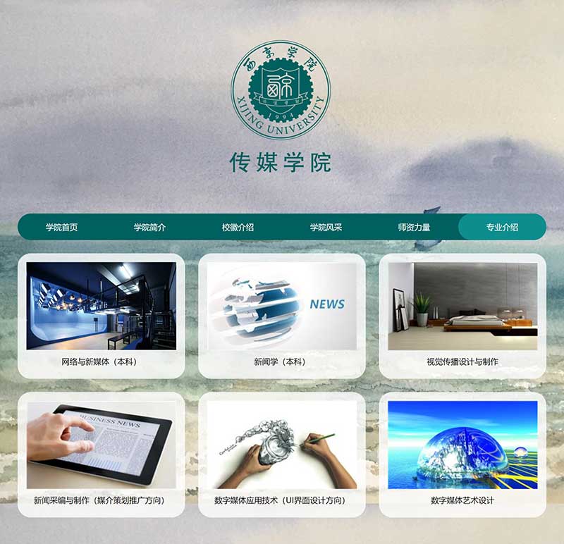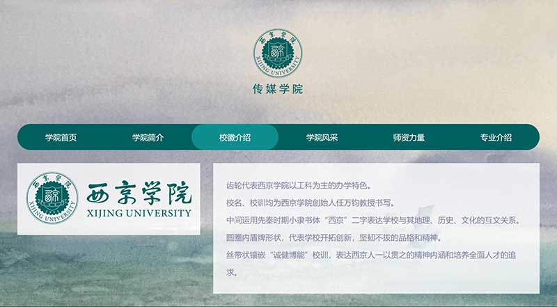 學校官網網頁制作設計作品采用div css布局制作,作品主題為西京學院-傳媒學院網站(作品下載后可自己更改學校)作品共6頁:學院首頁、學院簡介、校徽介紹、學院風采、師資力量、專業介紹。作品簡單,所用代碼為HTML5 CSS3基礎代碼。