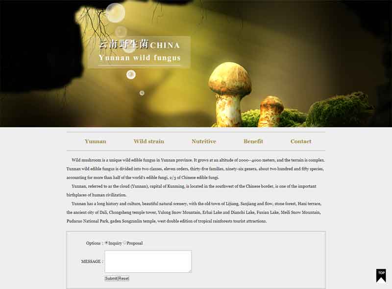 本作品為英文介紹云南野生菌的網頁作品,由表格table布局制作,首頁嵌入了背景音樂及flash氣泡特效,點擊進入首頁。頂部大圖為1348px寬度,內容區寬度為890px。三級結構,首頁-二級頁面-三級頁面。技術簡單,內容及排版豐富。共15個頁面。