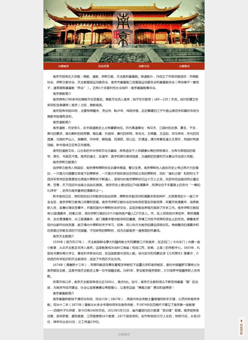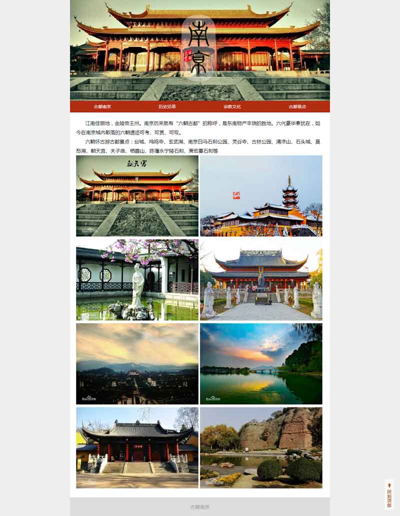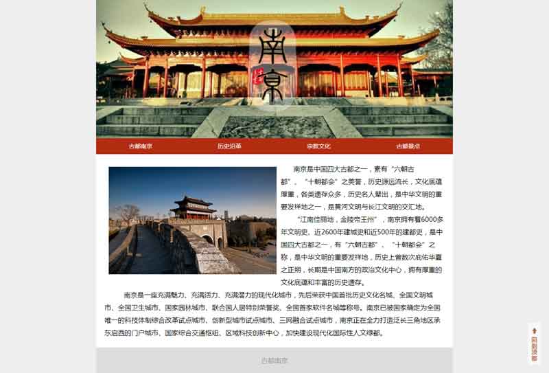 旅游題材學(xué)生網(wǎng)頁作品——介紹南京及景點(diǎn),作品共4個(gè)頁面,有返回頂部按鈕,首頁、文字頁面、圖文頁面適合日常學(xué)生網(wǎng)頁作業(yè)。表格布局,無復(fù)雜技術(shù)。