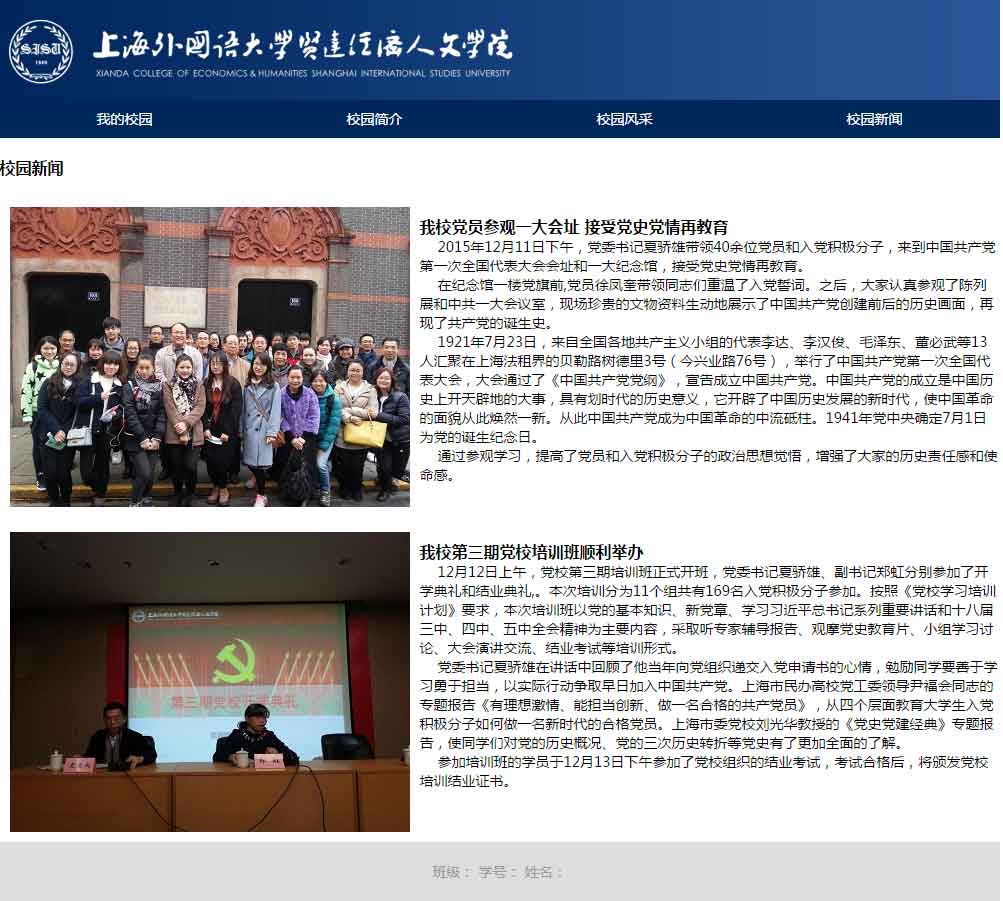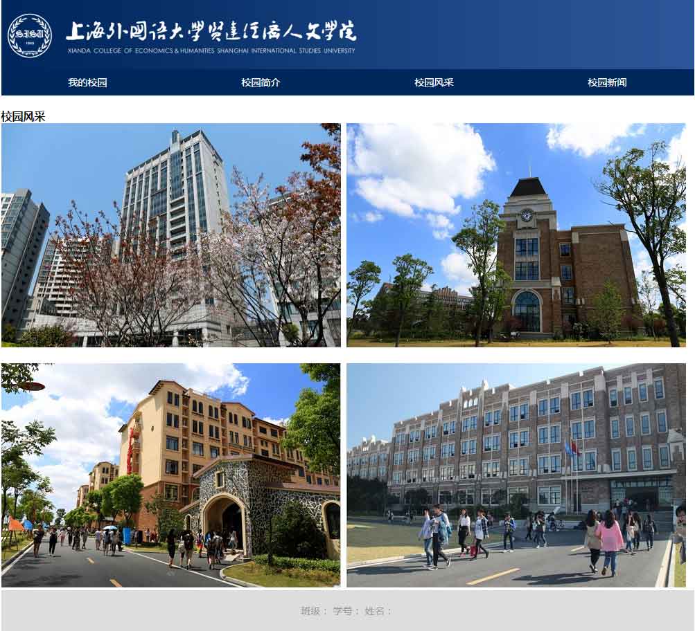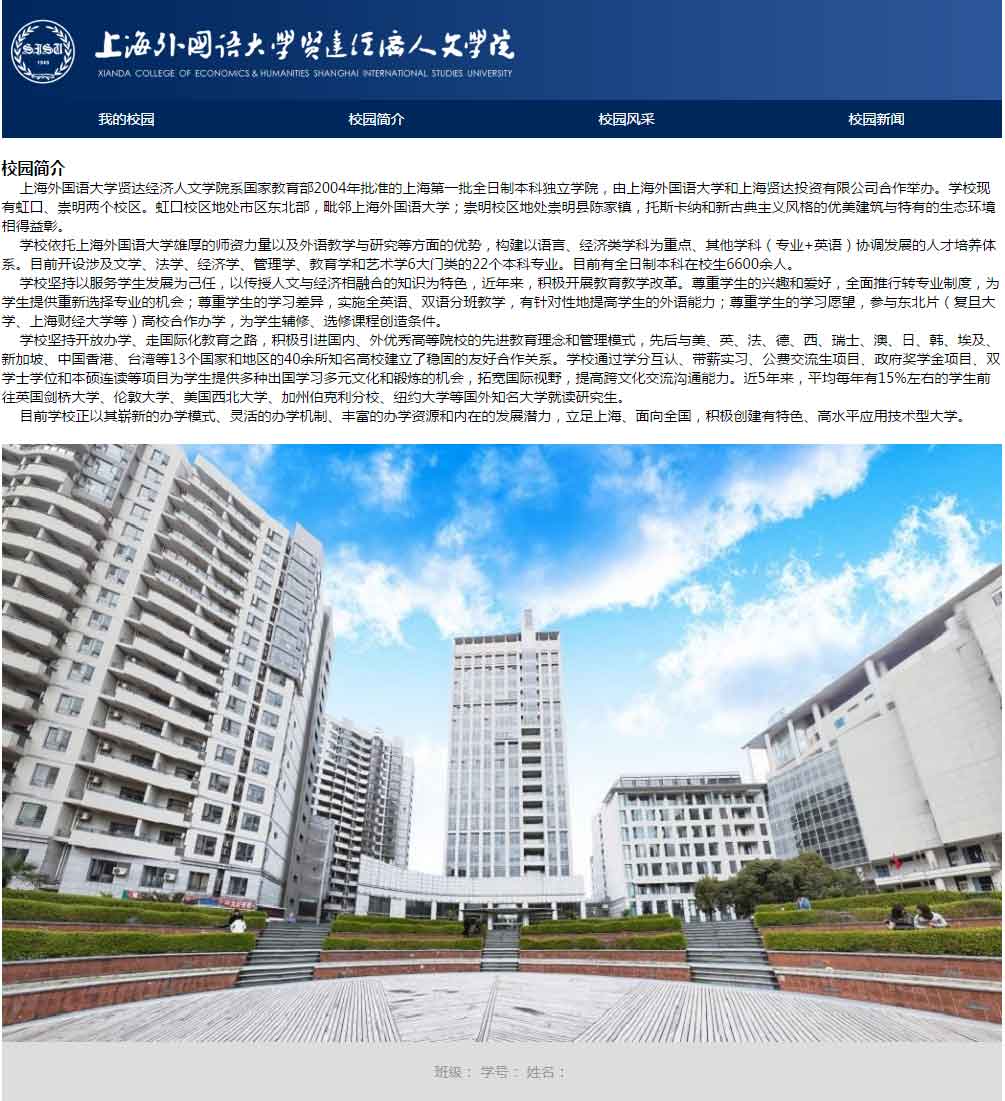 上海外國語大學賢達經濟人文學院——學校校園類題材網站成品免費下載,此作品頁面效果不錯,頁面布局類型無重復,首頁、詳情頁、新聞列表頁、圖片列表頁都是單獨的布局,共計4個頁面,另含FLASH大圖切換。