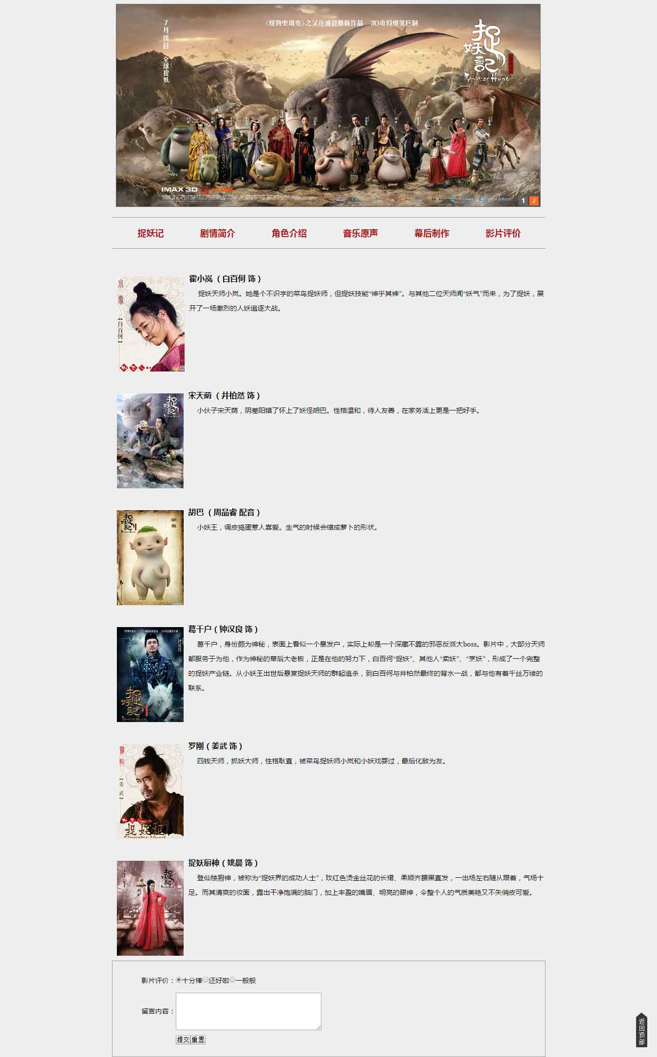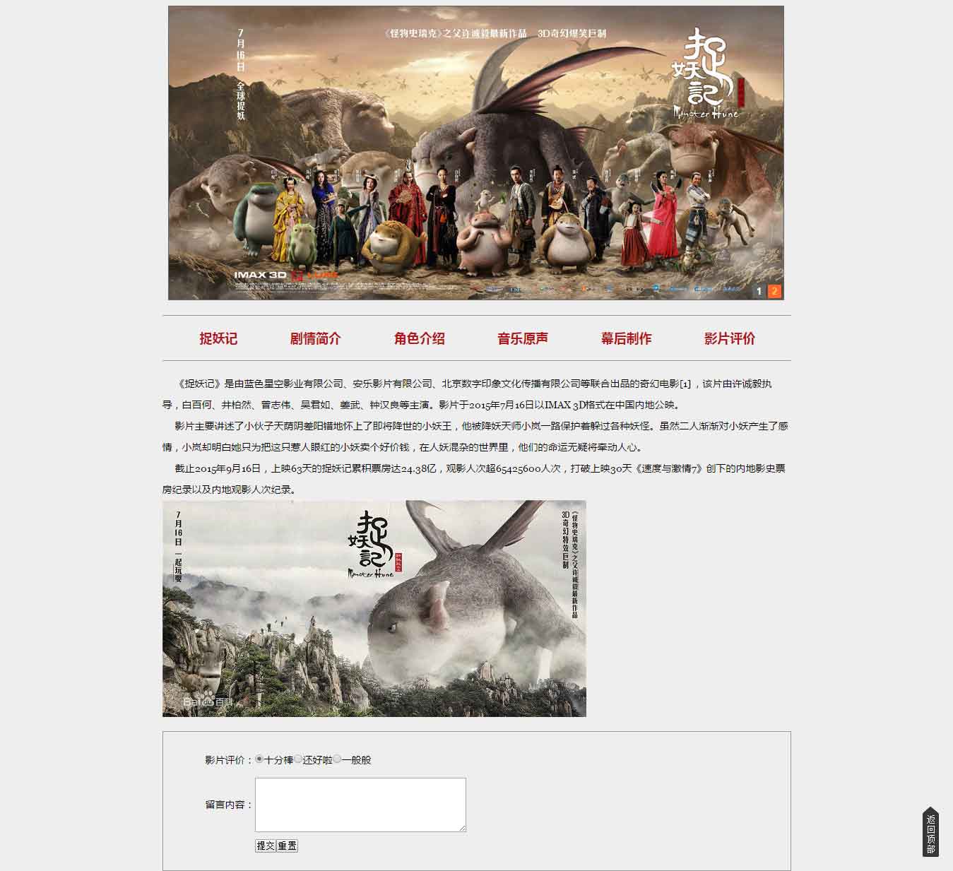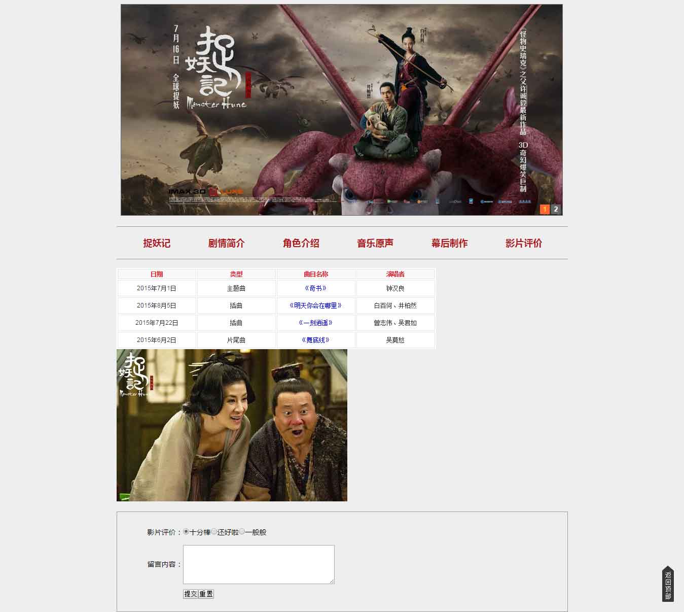 影視網(wǎng)頁設計作業(yè),電影類HTML學生網(wǎng)頁制作作業(yè)成品免費下載,本作品共計6個頁面,加入了大圖輪播功能,留言表單功能,在線音樂列表播放功能,整體視覺效果還是不錯的(電影題材類的作品有過時一說,所以建議免費下載學生網(wǎng)頁作品后,改為新電影題材)