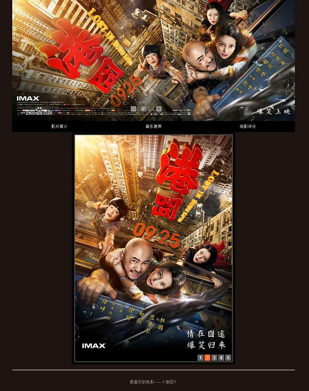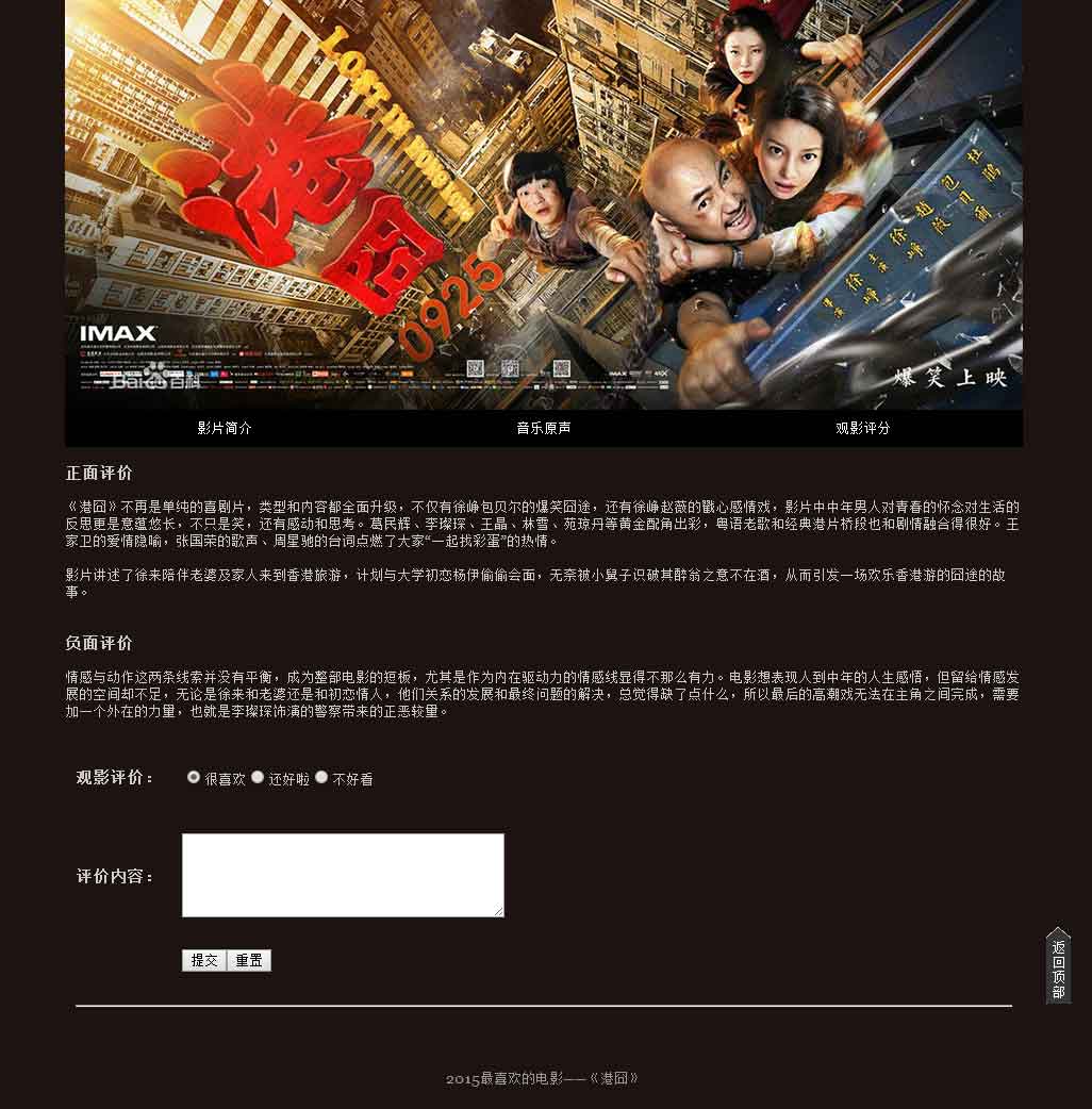 學生影視網(wǎng)頁作品——港囧電影題材類免費dreamweaver網(wǎng)頁設計作業(yè)成品,作品說明:作品共三個頁面,加入了留言表單功能,JavaScript彈窗功能,圖片幻燈輪播功能,在線音樂播放功能。