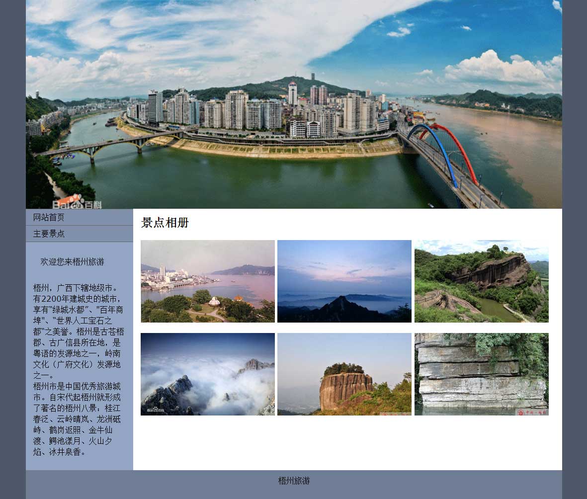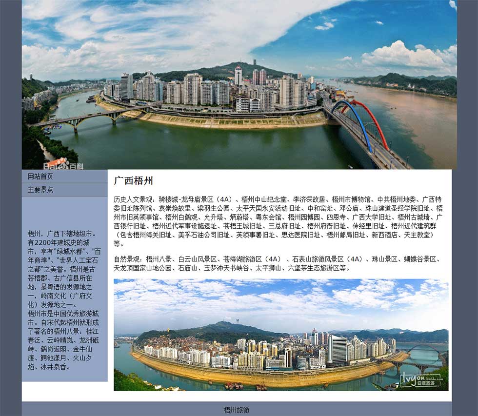 廣西梧州家鄉網頁設計作業旅游景點網頁制作學生作業成品模板:作品共2個頁面,使用dreamweaver制作div+css布局,頂部大圖為GIF動圖,左側加入文字滾動效果。無復雜代碼。